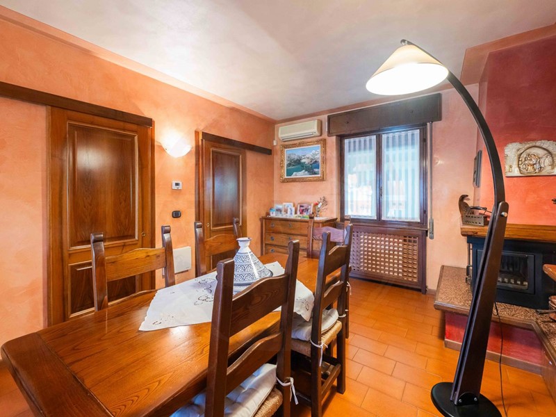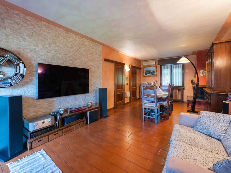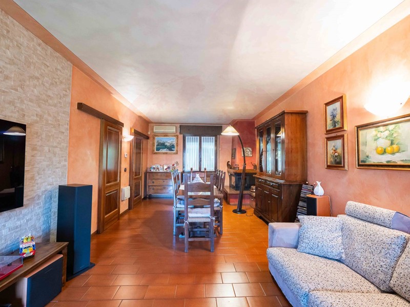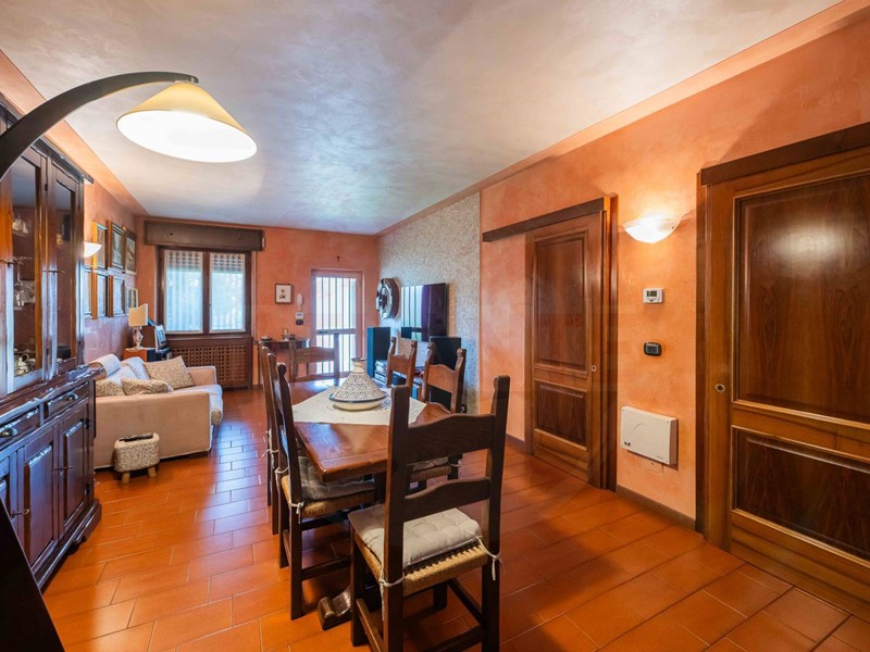 Zona giorno luminosa e accogliente, con soggiorno e sala da pranzo impreziositi da finiture calde, camino e dettagli in legno
