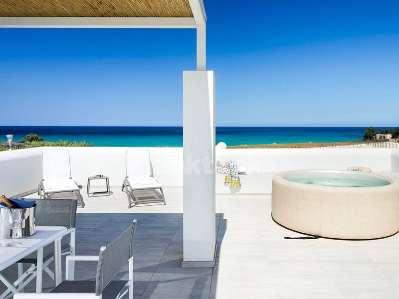 Allesterno, una piscina incantevole con vista panoramica sul mare, circondata da un terreno ben curato e impreziosito da piante grasse tipiche della flora siciliana, ti regalerà momenti di puro relax. Il terrazzo panoramico, con spettacolare vista mare, è dotato di una tettoia e di una jacuzzi, il luogo perfetto per sorseggiare un aperitivo al tramonto, mentre il dolce rumore delle onde ti accompagna in ogni momento.
