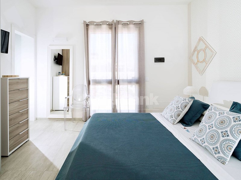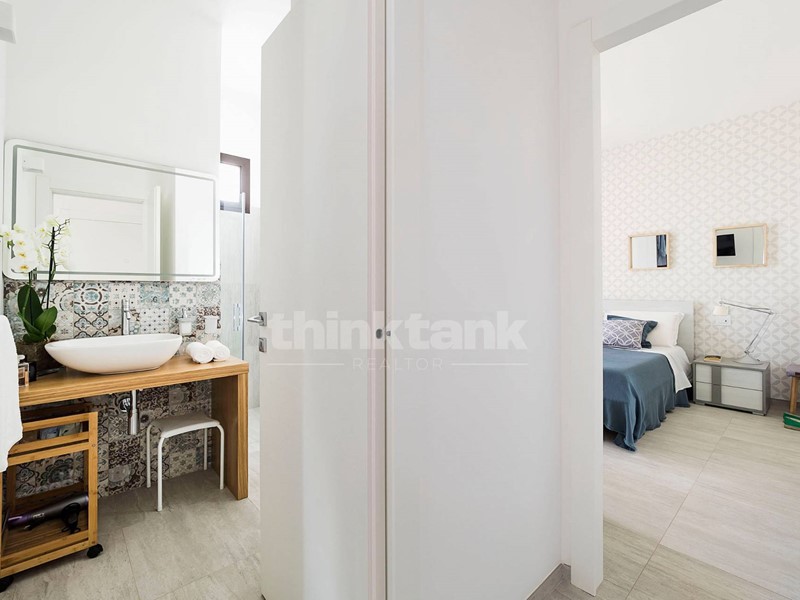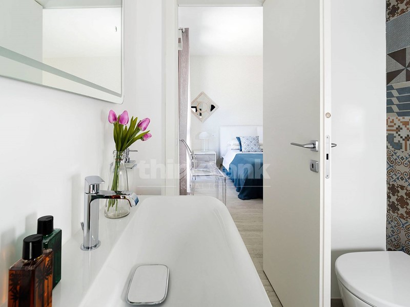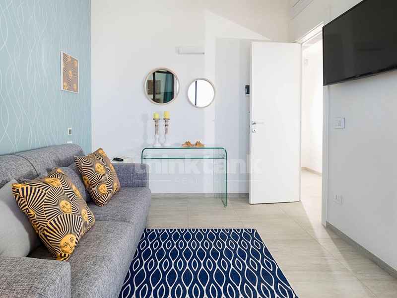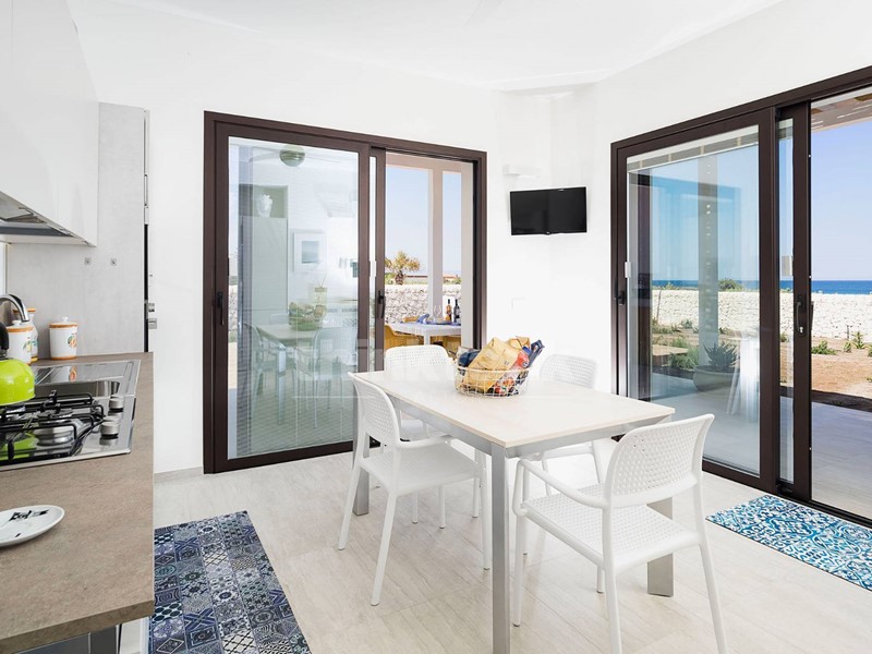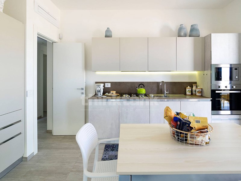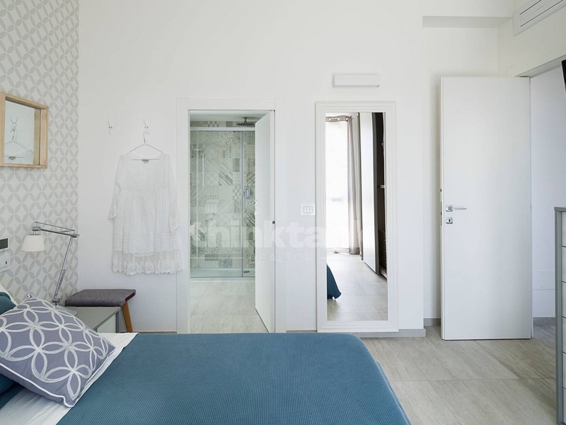 Limmobile è composto da un ingresso luminoso con cucina, che si apre sulla veranda esterna, perfetta per godere del clima mediterraneo. La veranda è dotata di un angolo barbecue e di un ampio pergolato, ideale per cene allaperto al tramonto, con il panorama del mare come sfondo. Il soggiorno, arredato con gusto, include un comodo divano letto, mentre le due camere matrimoniali con bagno en-suite garantiscono il massimo del comfort e della privacy. A completare la metratura interna, un terzo bagno che funge da servizio alla zona living.