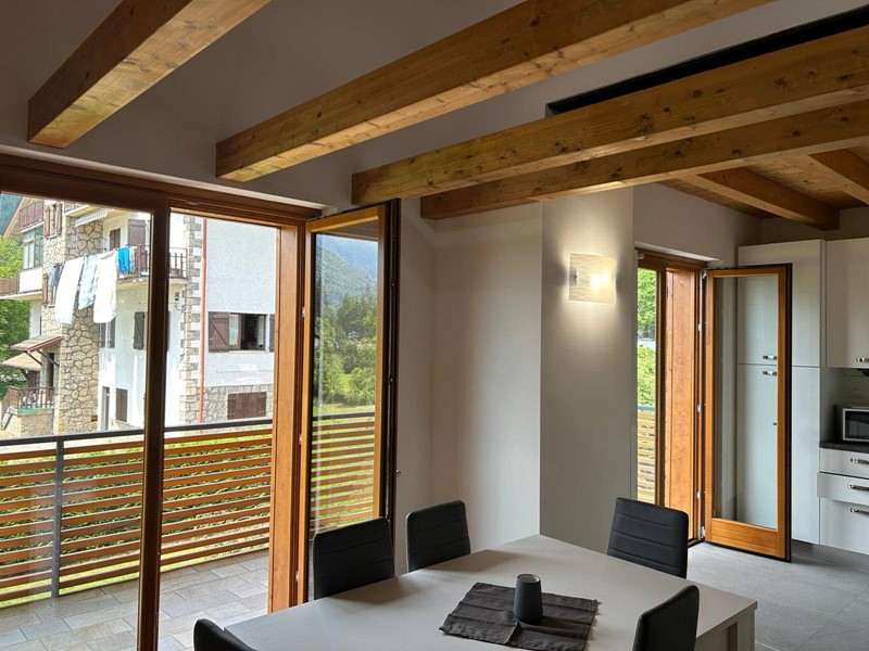 Cucina a vista con accesso diretto su un ampio terrazzo vivibile, perfetto per pranzi all'aperto, con una splendida vista sulla Presolana,