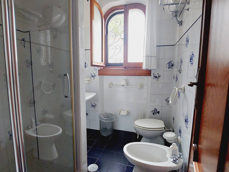 Al piano inferiore si trovano altre 2 camere da letto matrimoniali, sempre con il proprio bagno privato, la cucina abitabile e un ampio soggiorno che si apre su una grande veranda con vista panoramica sul mare.