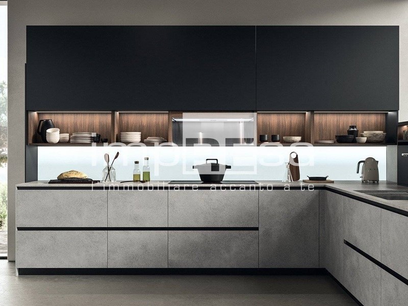 Ingresso nella grande zona giorno di 41 mq con zona pranzo e cucina a vista, dalla grande vetrata si esce sul terrazzo per godere dell'esterno ricco di vegetazione dove poter sistemare tavolo e salottino estivo, antibagno e bagno giorno.