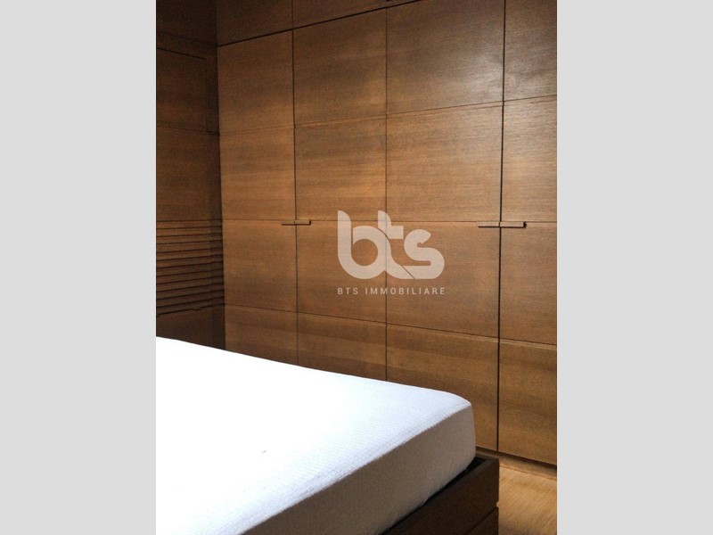 Una porta scorrevole a scomparsa separa la camera di misura matrimoniale con ampi spazi di armadiature a effetto scomparsa.
