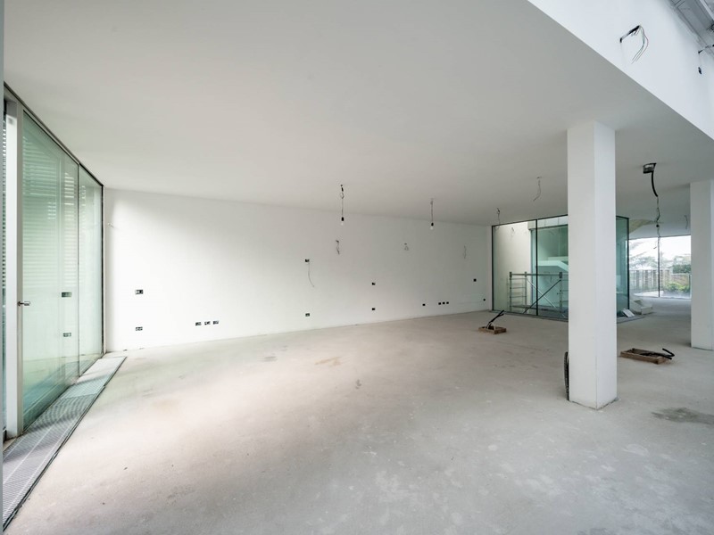Gli spazi interrati, altrettanto curati, includono una camera aggiuntiva, uno studio, una pratica lavanderia e un terzo bagno. Il primo piano interrato ospita anche il locale tecnico, con accesso diretto all'esterno sul lato del lago, mentre al secondo piano interrato si trova un box quadruplo di circa 60 mq.