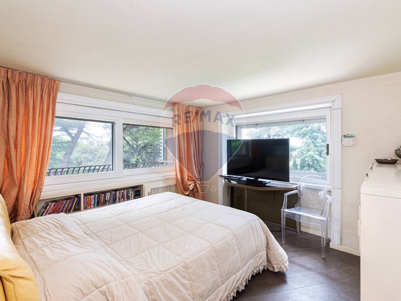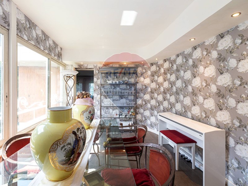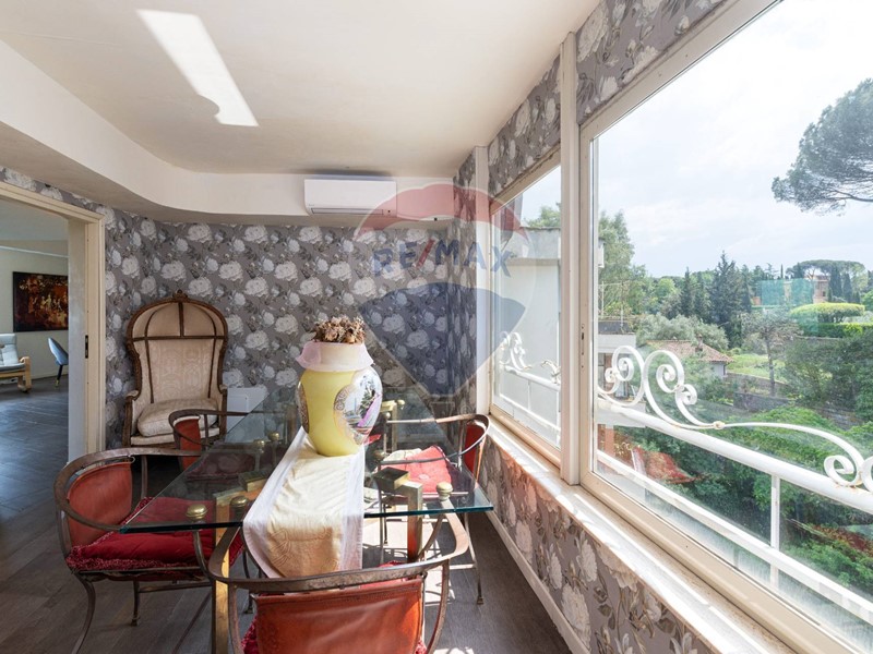L'immobile è posto al piano super attico ed è composto da un luminoso doppio salone, una cucina separata e una veranda chiusa, ideale per momenti di relax. Dispone di due camere da letto, con la possibilità di creare una terza stanza per soddisfare esigenze diverse. Una cabina armadio posta nel disimpegno che precede la camera padronale, offre ulteriore spazio per l'organizzazione. Gli spazi esterni sono generosi: da una camera da letto abbiamo un panoramico balcone perimetrale con affaccio sul parco retrostante. mentre dalla zona giorno accediamo all'ampio terrazzo di 150 mq. Dallo spazio esterno principale si può godere di una vista mozzafiato sul centro di Roma.