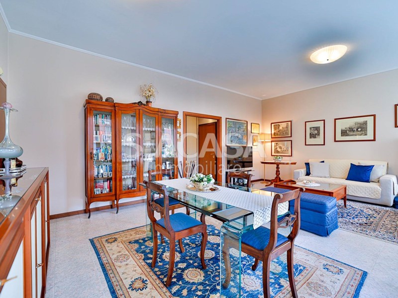 Ampio soggiorno doppio con sala da pranzo e unintera parete vetrata che inonda gli spazi di luce naturale. Affaccio su balcone riservato.