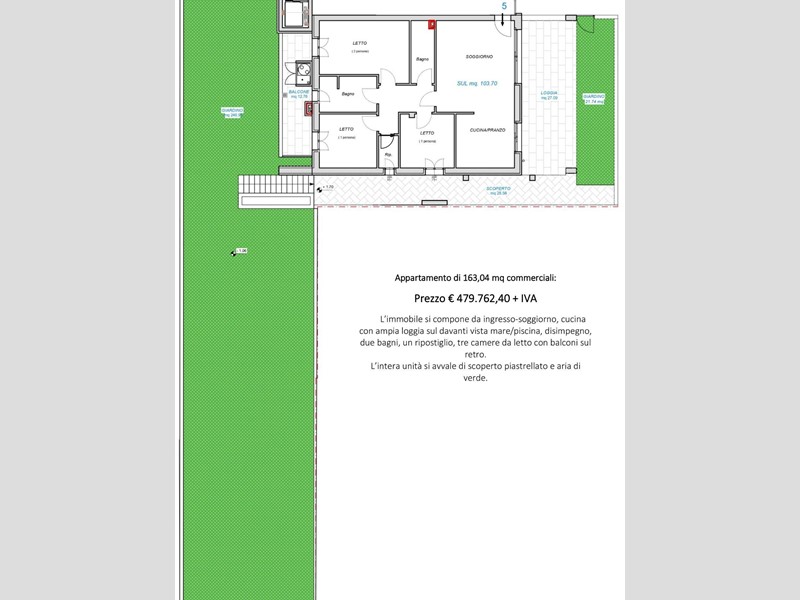 Posto al piano terra limmobile con una area di 103.70 mq si compone da ingresso-soggiorno, luminosa ed abitabile zona cucina pranzo con ampia loggia sul davanti e giardino 21 mq vista mare/piscina, disimpegno, luminoso bagno principale e secondo bagno, un ripostiglio, tre camere da letto con balconi e finestra sulla parte più tranquilla e protetta del complesso.