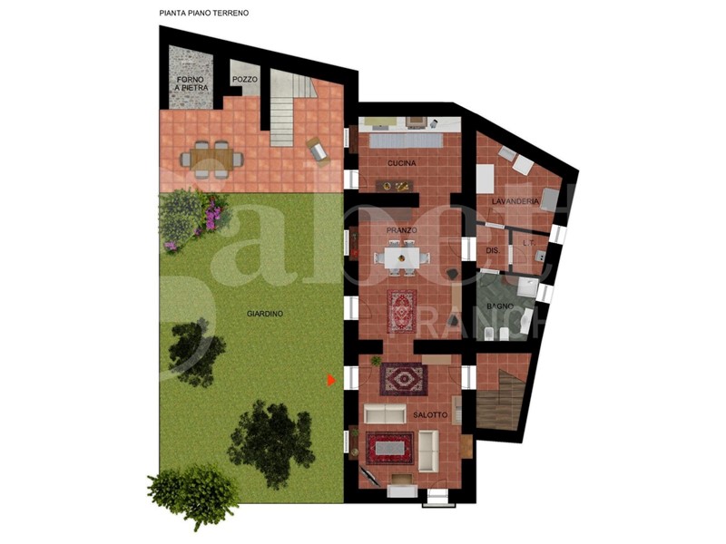 Al piano terreno, la zona giorno si apre luminosa e fluida: la cucina con volte a botte, la sala da pranzo e il salotto si susseguono senza soluzione di continuità, favorendo convivialità e armonia. Il bagno, rifinito in marmo, e la lavanderia, discreta e funzionale, completano questo piano concepito per il quotidiano vivere con naturalezza.