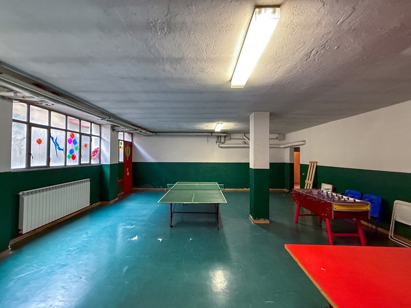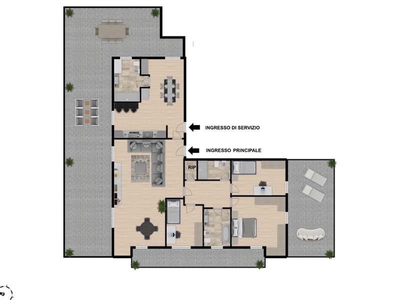 Entrando dall'ingresso principale accediamo in un luminoso soggiorno doppio (50mq) dotato di camino e circondato dal terrazzo principale, una la cucina di 30 mq include un'ampia sala da pranzo perfetta per famiglie numerose e si completa con un bagno/lavanderia.
