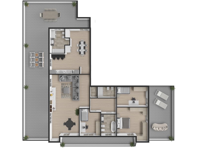 La zona notte include tre camere da letto tutte ampie e dotate di porta balcone che accede ai terrazzi, due bagni e un ripostiglio.