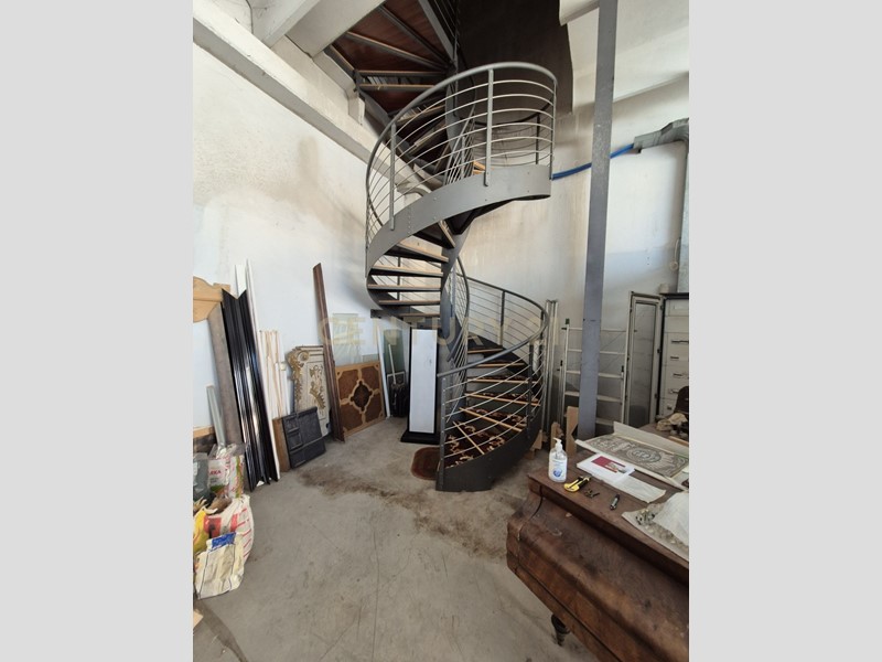 I due livelli sono collegati da una grande scala a chiocciola interna di forte impatto visivo e da una scala esterna in ferro zincato posta sul retro.