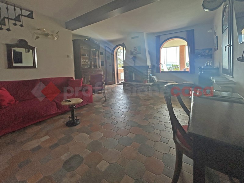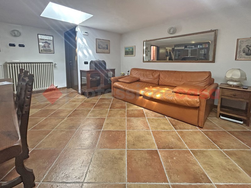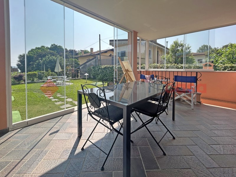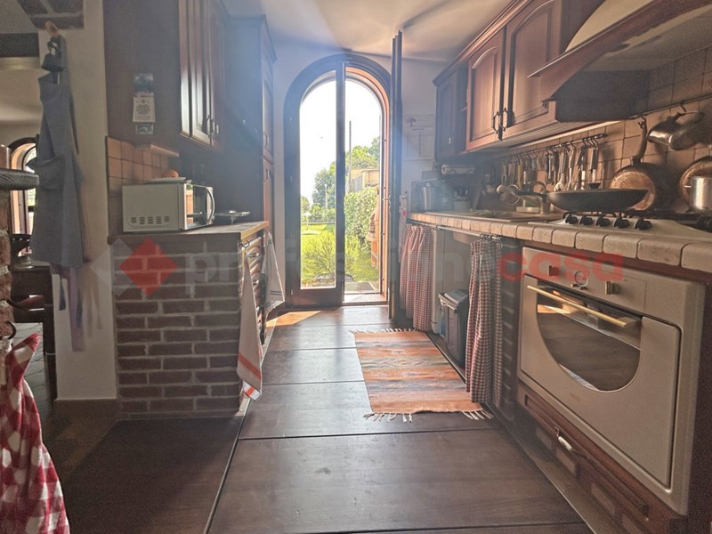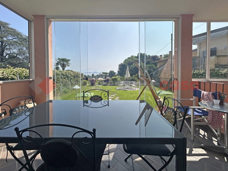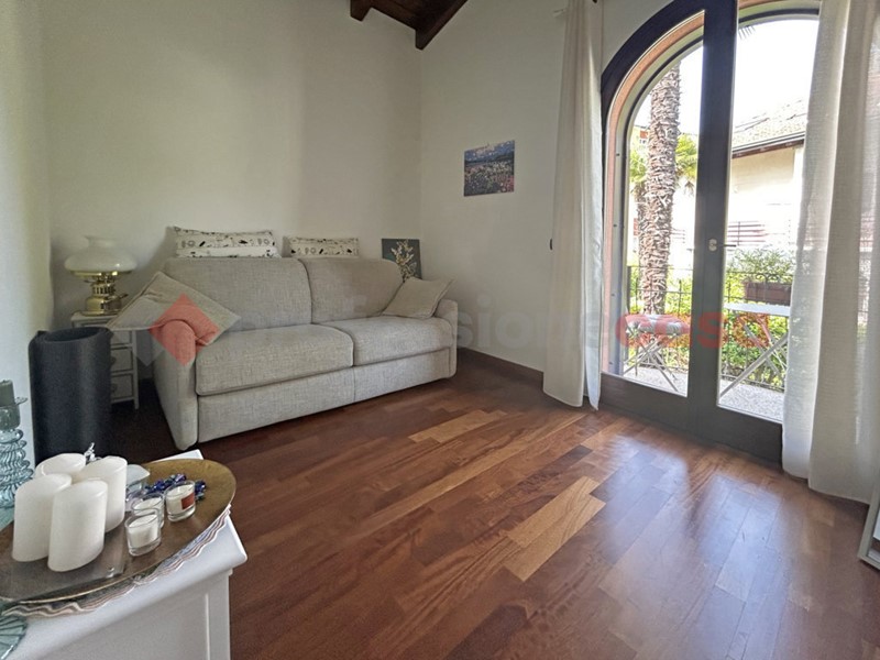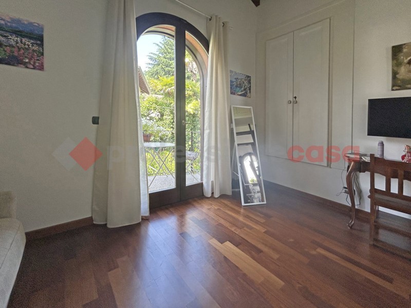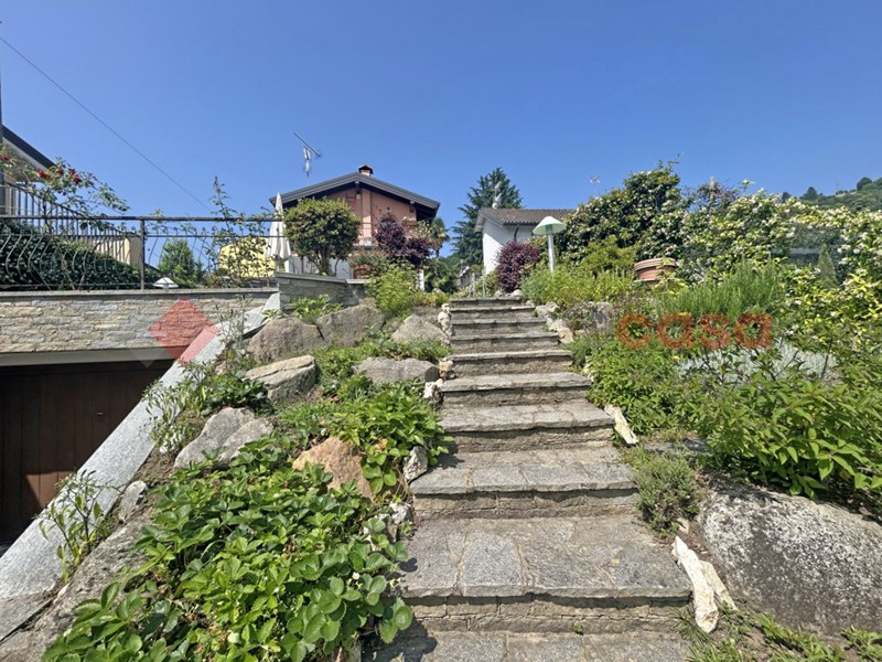L'immobile ha un doppio accesso, dalla strada principale dove l'ingresso avviene tramite un passo carraio con cancello elettrico e un cancelletto pedonale che portano al giardino con alberi da frutto. Tramite una scala in granito, si accede al giardino panoramico di circa 600mq dal quale vi è l'accesso alla zona giorno, che è composta da soggiorno con camino a ventilazione forzata, cucina in muratura con affaccio sul giardino con barbecue, veranda chiusa e riscaldata per l'inverno, ripostiglio e un bagno. Al primo piano troviamo la zona notte, composta da una camera matrimoniale con terrazzo vista lago, seconda camera con balcone e armadio a muro, bagno con doccia.