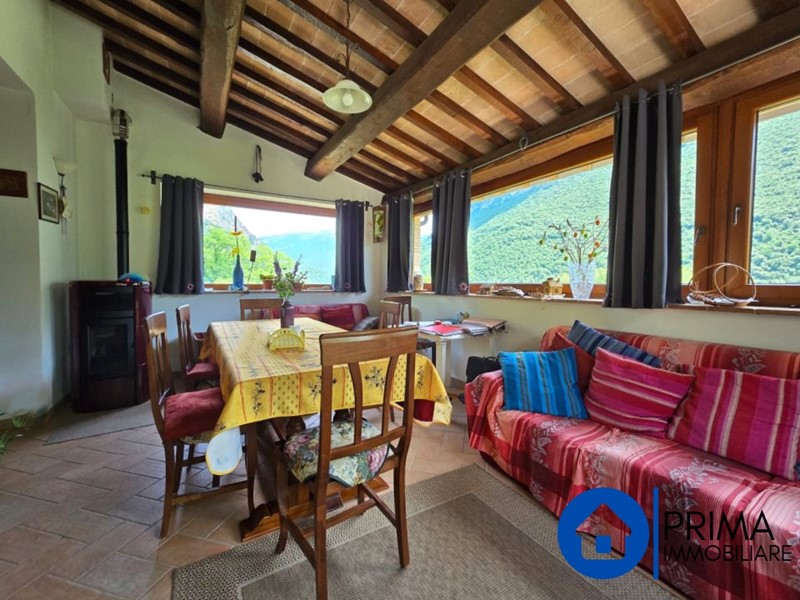 Nella meravigliosa cornice verde della Valnerina, incastonato tra le colline di Ferentillo, proponiamo una splendida villa in pietra ristrutturata, attualmente adibita per metà ad abitazione e per metà a struttura ricettiva.\nLa villa sorge su un dolce pendio ed è abbracciata dal terreno di proprietà che si estende per 31048mq ca., qui tra ulivi, cipressi e erbe aromatiche è stato creato una zona cottura esterna con camino e forno in pietra e una piscina di 11mtx 4,20mt., un angolo di relax unico dove respirare aria pulita e rilassarsi in un modo inspiegabile.\nL'abitazione, totalmente indipendente, è rivestita in pietra con dettagli esterni in legno creando un fascino retrò che ben si sposa con la location. \nLa casa è disposta su due livelli; al piano terra si entra dal portoncino blindato verso un ampio ingresso arricchito da grande camino, andiamo poi verso la zona giorno in cui esplode la luce grazie alle numerose vetrate che affacciano sulla vallata quasi a creare un sun room. Proseguendo c'è un'ampia sala da pranzo e la cucina abitabile con uscita sul portico. Nella zona notte troviamo 2 camere matrimoniali e due bagni con finestra e doccia. In tutta l'abitazione si nota il soffitto rustico in travi in legno a vista, i pavimenti in cotto e le porte in legno scuro, un perfetto abbinamento per un fascino senza tempo.\nIl piano sottostante, interrato solo per un lato, è composto da 3 appartamenti bilocali, ognuno con un proprio ingresso, composti rispettivamente da una zona giorno open space con angolo cottura, una camera da letto e un bagno. Questa zona della casa è adibita a B and B.\nLa casa è stata totalmente ristrutturata, è dotata di infissi in vetri doppi, stufa a pellet e pannelli solari.\nL'abitazione può essere adibita all'uso più consono alle nostre esigenze, può diventare totalmente una struttura ricettiva, o si può trasformare il piano terra come taverna o altra, le possibilità sono molteplici.\nQuesta casa rappresenta un angolo di paradiso in terra, un'oasi di totale relax e fuga dal caos cittadino e dalla caotica vita quotidiana... contattaci e immergiti con noi in questo luogo incantevole.\n - Maggiori Dettagli: Porta blindata, Camino, Cantina, Predisposizione aria condizionata