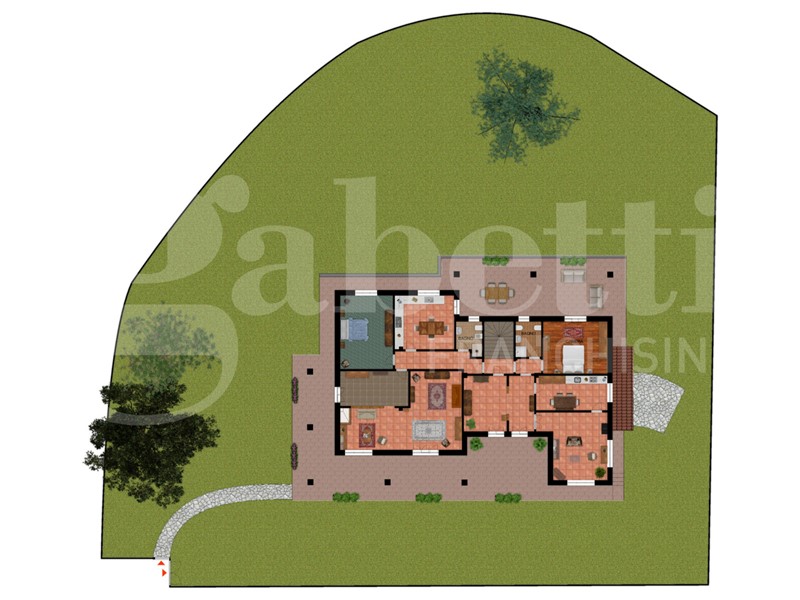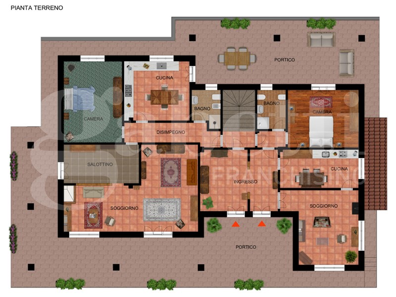 Un raffinato porticato coperto su tre lati funge da naturale prolungamento della casa verso l'esterno, offrendo spazi vivibili in ogni stagione, perfetti per accogliere ospiti o per momenti di quiete all'aria aperta.