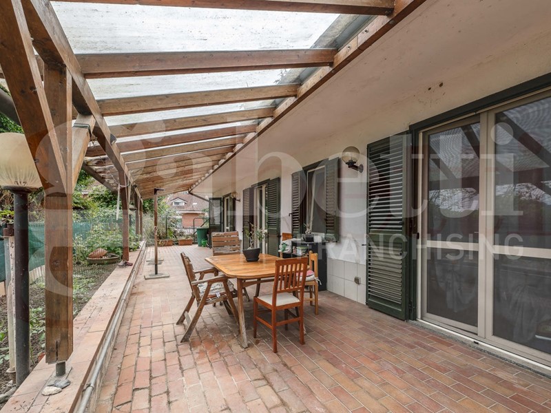 Edificata nel 1995, la soluzione è suddivisa in due appartamenti collegati tra loro da scala interna e posti rispettivamente al piano terra ed al piano primo mansardato; inoltre un grande cortile pavimentato davanti alla facciata di ingresso, il giardino ed il comodo porticato ai lati completano la parte abitabile dell'esterno al piano terra.