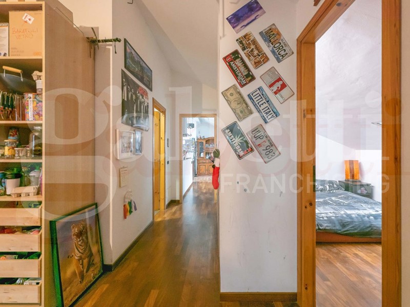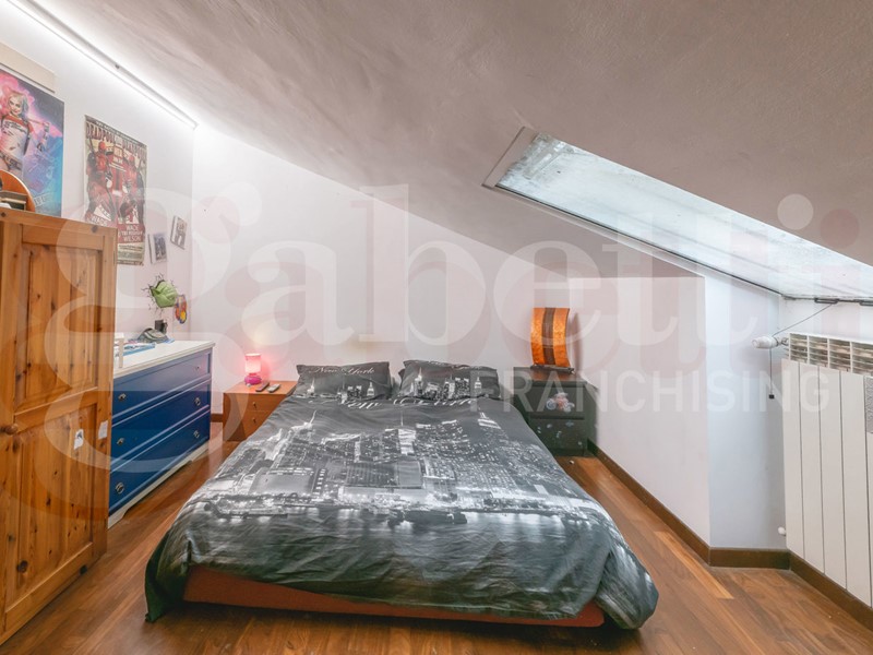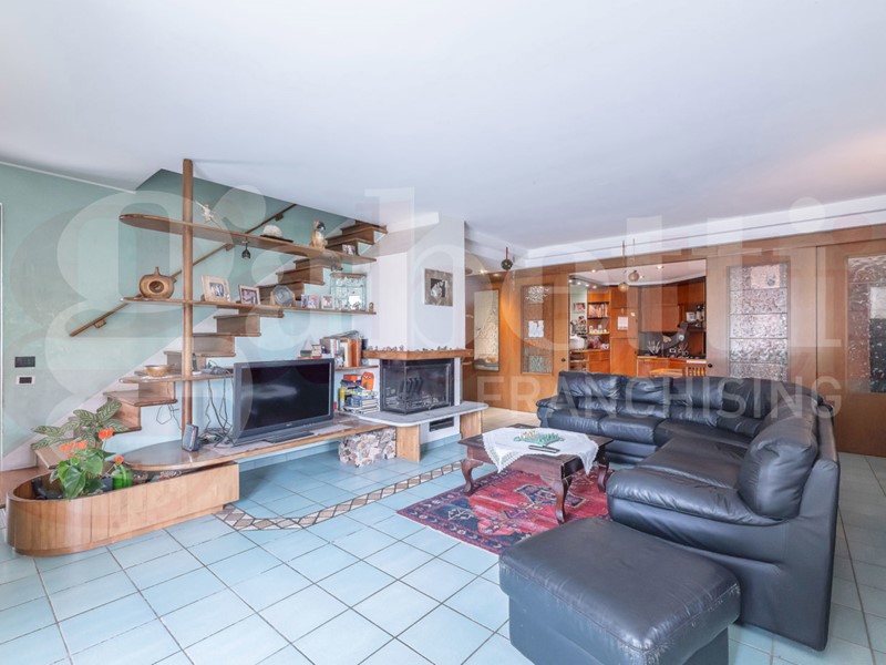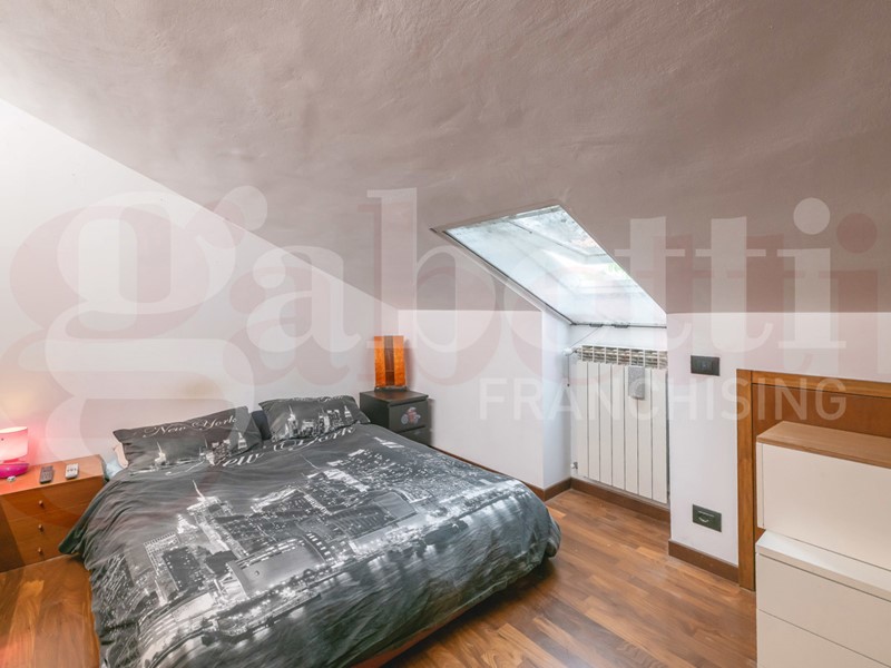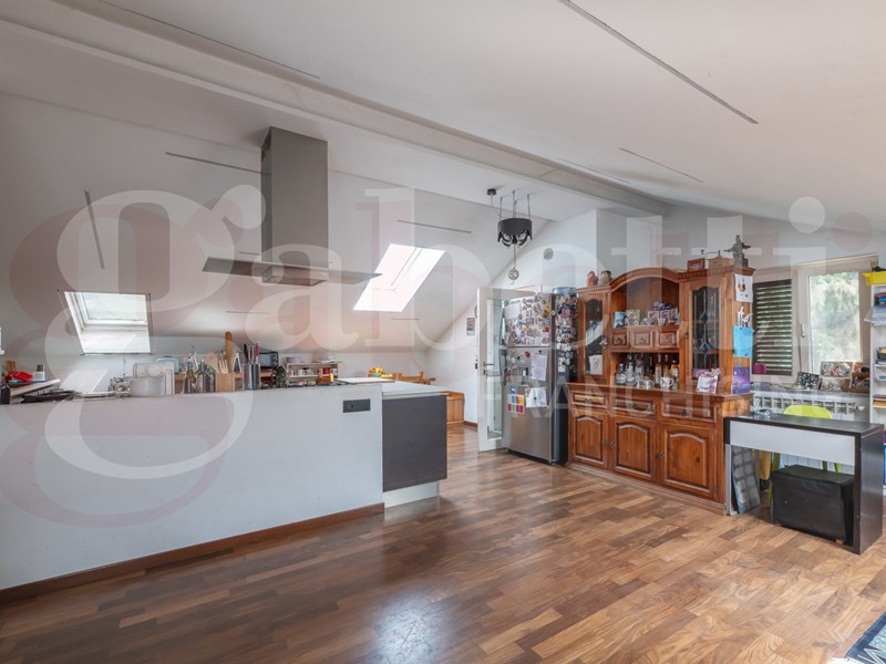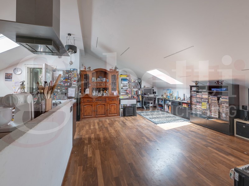 Appartamento al piano mansardato: ampio locale living con zona conversazione e cucina a vista con penisola, disimpegno, due camere e servizi.