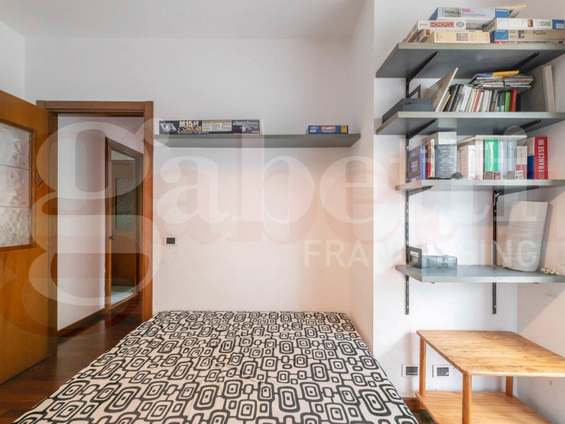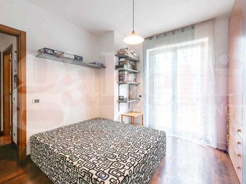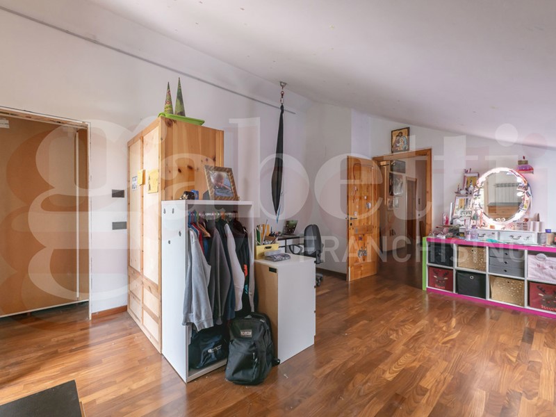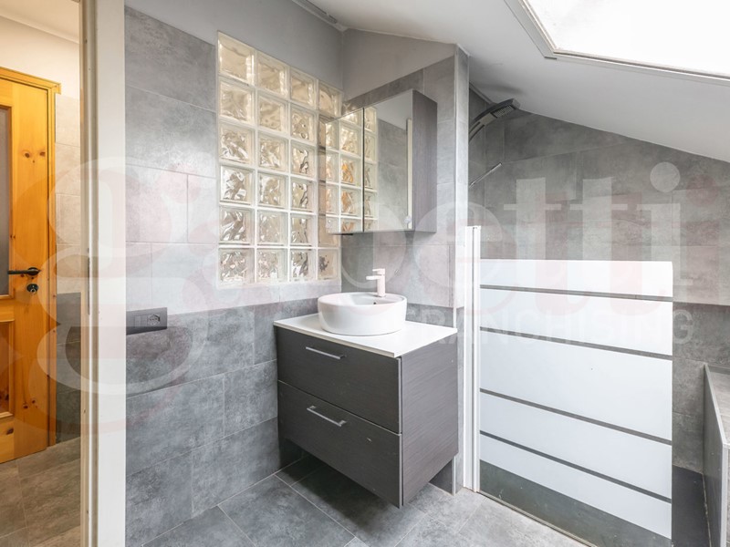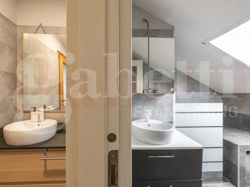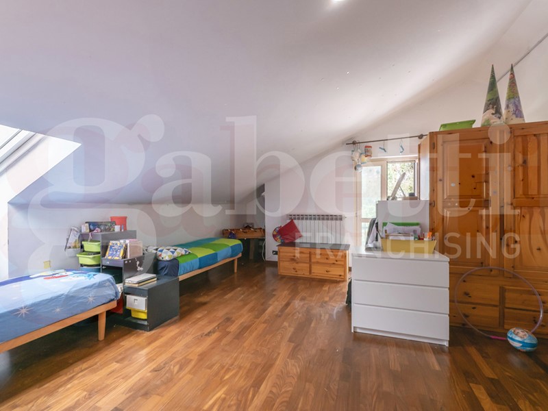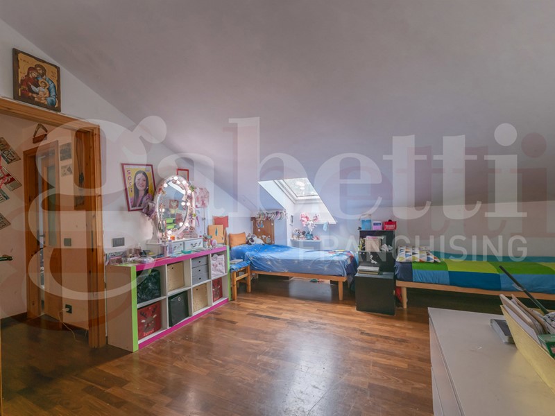 Appartamento al piano mansardato: ampio locale living con zona conversazione e cucina a vista con penisola, disimpegno, due camere e servizi.