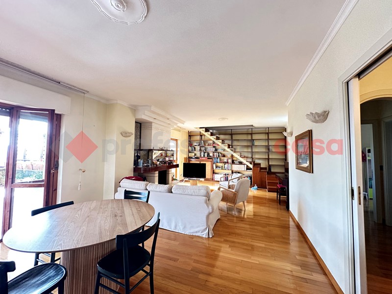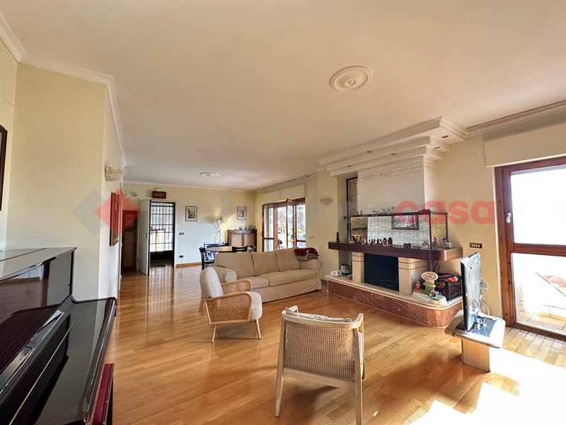 L'ingresso si apre su un ampio salone con parquet e camino, caratterizzato da un'atmosfera accogliente e da grandi vetrate che conducono al terrazzo principale, dotato di pergotenda elettrica, perfetto per momenti di relax e convivialità all'aperto.