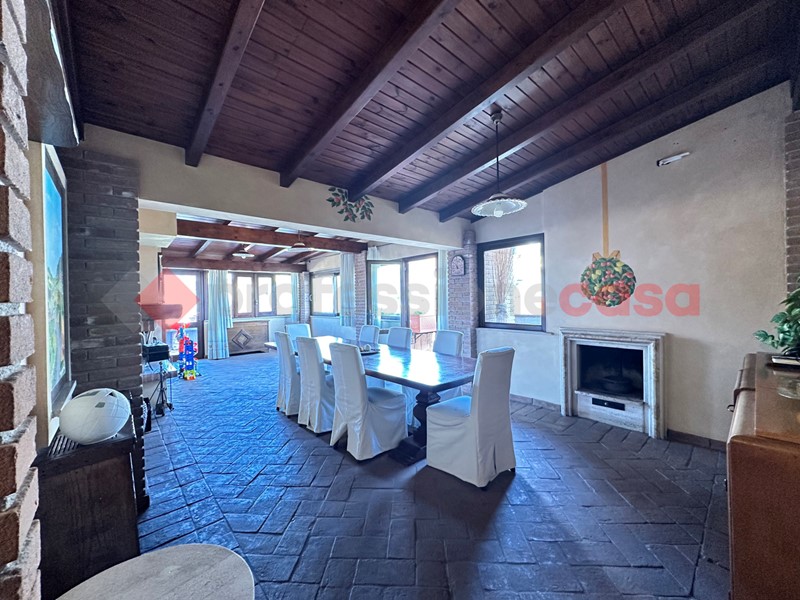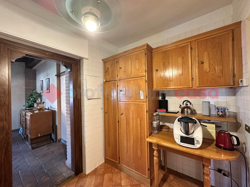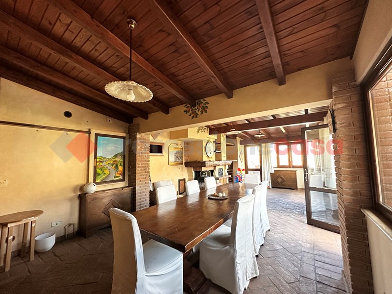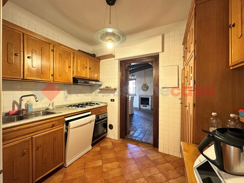La cucina e sala da pranzo in stile rustico, arricchite da pavimenti in cotto e da un secondo camino, creano un ambiente conviviale e dal fascino autentico.