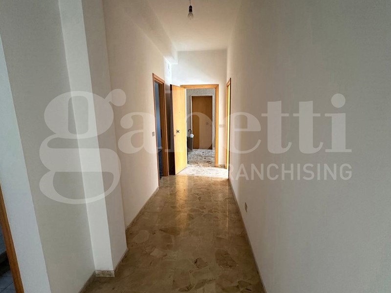 Il trivani, in discrete condizioni e con rifiniture dell'epoca, ha ingresso sul corridoio, grande salone con primo balcone condiviso, cucina abitabile con il secondo balcone condiviso, bagno principale con vasca e finestra, doppio servizio con spazio per la lavatrice e box doccia e finestra, camera matrimoniale con accesso al primo balcone condiviso, camera da letto con accesso al secondo balcone condiviso, ripostiglio. Completa la casa il posto auto singolo coperto (presente nel garage comune di 229 mqc, dove è presente anche lo sgabuzzino) e la terrazza comune.