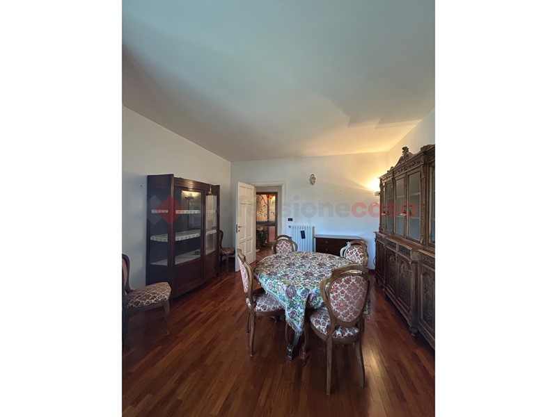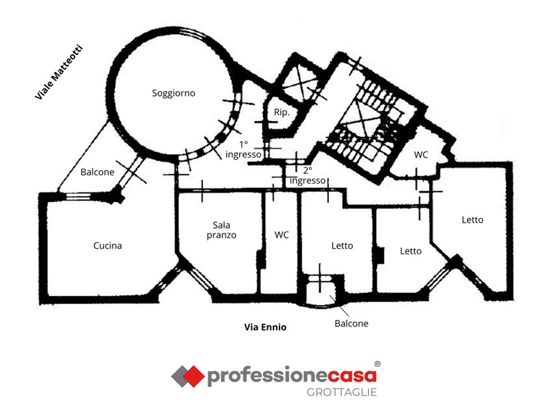 L'ingresso principale si apre su un disimpegno che conduce alla zona giorno, composta da una comoda cucina abitabile con piano in muratura, che grazie a un grazioso balconcino affaccia su Viale Matteotti, segue una sala da pranzo con pavimento in parquet e un pratico ripostiglio. Punto di forza dell'abitazione è l'elegante soggiorno circolare, caratterizzato da porte in vetro decorato che conferiscono luce naturale e un'atmosfera ricercata all'ambiente. A servizio di quest'area si trova un primo bagno.