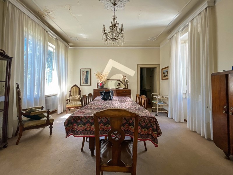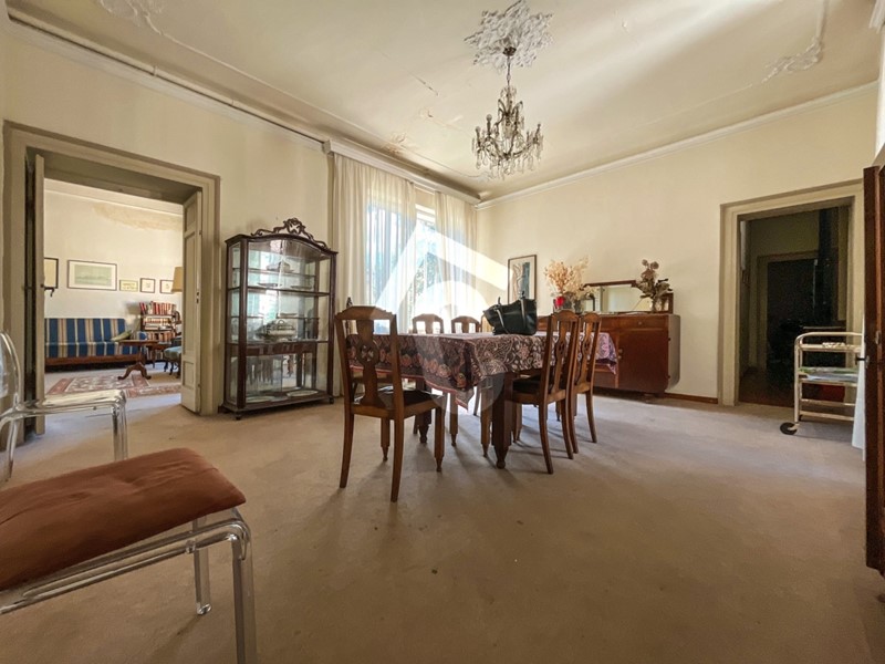 Gli spazi si suddividono in una grande sala da pranzo, una cucina abitabile, due soggiorni di rappresentanza, sei camere, uno studio e due bagni.
