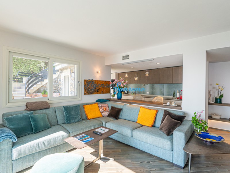 L’ingresso avviene attraverso una porta blindata che introduce in un luminoso soggiorno dalle ampie vetrate affacciate a sud, che inondano gli ambienti di luce naturale e regalano scorci incantevoli sull’esterno. Dalla zona giorno e dagli spazi esterni si gode di una vista mare mozzafiato e di un panorama aperto che abbraccia il verde della collina fino all’azzurro del Mediterraneo.