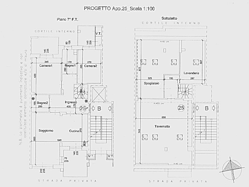 La planimetria presente in questa scheda è una “planimetria tipo”, i piani in cui è inserito questo appartamento bilivello in vendita sono il sesto ed il settimo, la sua composizione è la seguente: ingresso, cucina-soggiorno in un ambiente unico di circa 32 metri quadri, due camere, due bagni, terrazzino lato cucina-soggiorno e due balconi lato interno (superficie commerciale di questo piano circa 112 mq); scala interna per accesso al settimo piano su ampio sottotetto di circa 103 mq, e con altezza al colmo di circa 4 metri, diviso in due ambienti, definiti spogliatoio e tavernetta, oltre grande locale lavanderia (è presente l'accesso a questo piano anche dal pianerottolo).