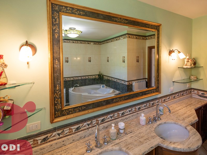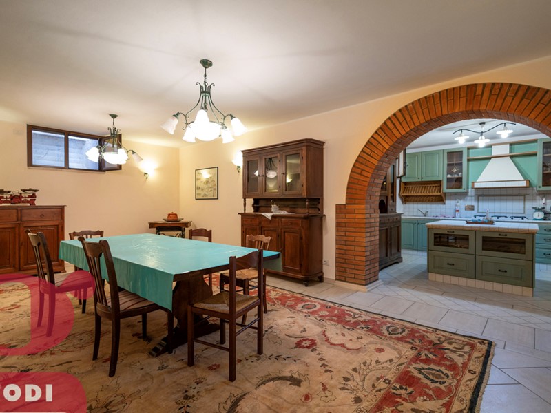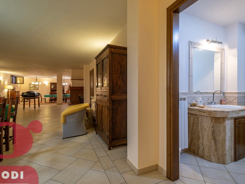 Al piano inferiore, cui si può accedere sia dall'esterno che tramite scala interna, si trovano il garage di 130 mq (142 mq catastali), uno spazio di 190 mq adibito a taverna con cucina e caminetto; ed ancora un ripostiglio, un'ampia lavanderia che funge anche da comodo locale di sgombero ed un bagno, per un totale di altri 50 mq.