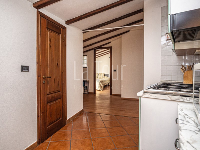Gli ambienti sono valorizzati dal soffitto con travi in legno a vista, che dona calore senza appesantire lo spazio. I lucernari Velux assicurano un’ottima luminosità naturale in ogni ambiente.
