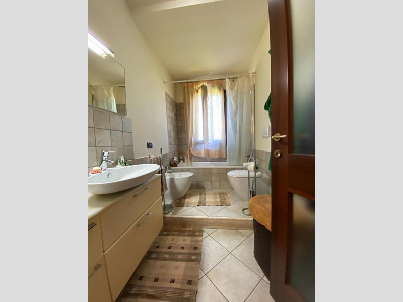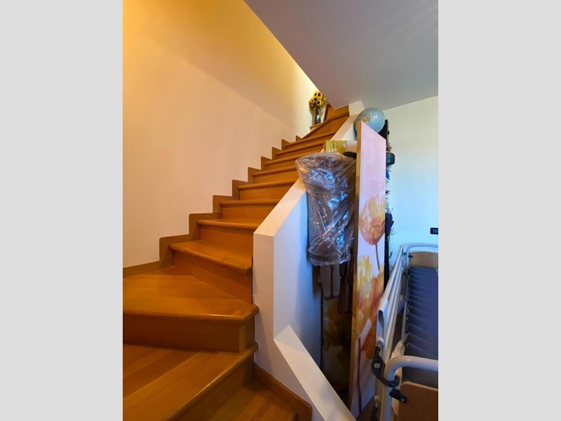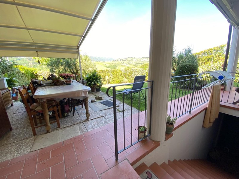 Completa la proprietà ampio giardino su de lati con loggiato, accessibile sia dalla zona giorno del piano terra sia dalla parte semi-interrata e due posti auto interni alla proprietà con cancello carrabile.