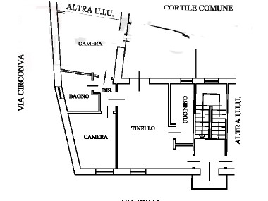 Trilocale al 1 piano (secondo fuori terra) ristrutturato nel 1983, composto da due camere, tinello con cucinino, servizio e terrazzino, facente parte del fabbricato di civile abitazione posto in via Circonvallazione angolo via Roma numero civico 1 (uno), entrostante all’area distinta al foglio 18 particella 25 (ente urbano di mq. 255). Completa la dotazione un posto auto nella corte comune.