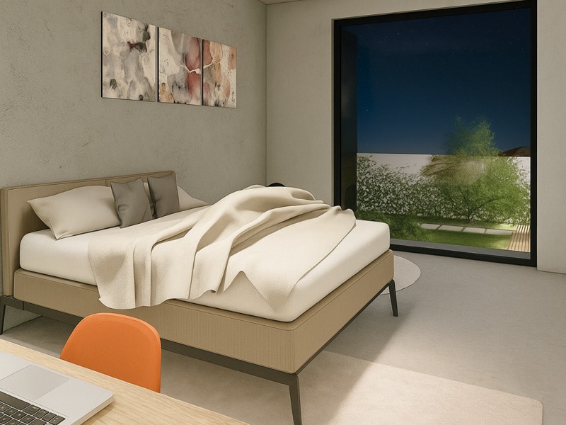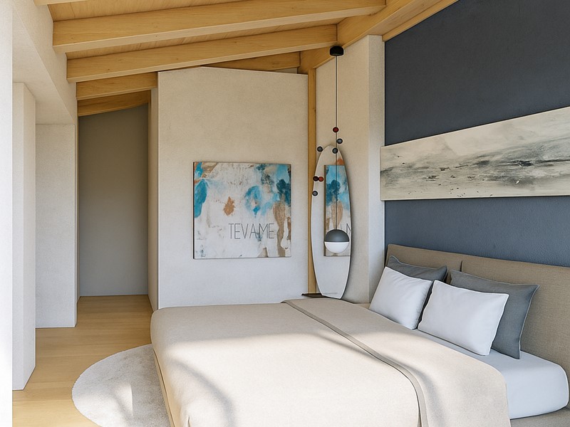 Il piano primo, di 80 mq, comprende una camera matrimoniale con cabina armadio e balcone, due camere doppie e un ampio bagno finestrato.