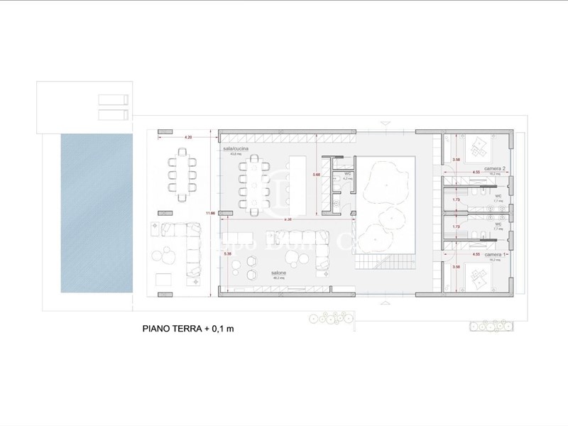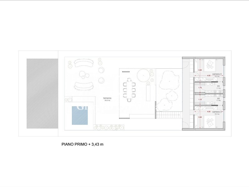 La proprietà si sviluppa su tre livelli per circa 450 mq complessivi, ed è immersa in un lotto di 1.250 mq con piscina privata di 55 mq, zona solarium e due posti auto coperti.