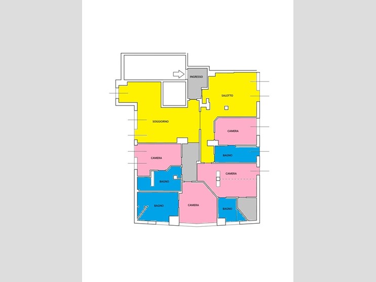 L'appartamento è predisposto ad una possibile suddivisione che permetterebbe con minimi interventi di realizzare 2 trilocali con 2 servizi ciascuno di circa 90 mq l'uno.