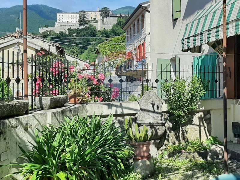 The outdoor spaces, covered by the shaded pergola, are perfect for relaxing and enjoying peaceful moments with a fantastic view of Castelbrando, all while being immersed in the welcoming atmosphere of one of Italy's most beautiful villages.