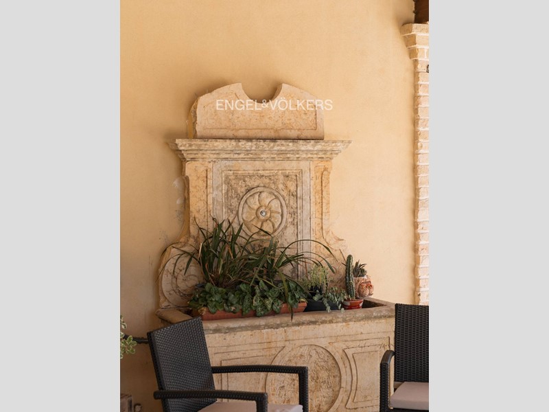 Un caratteristico portico in pietra con area salotto e fontana rende latmosfera ancora più suggestiva.