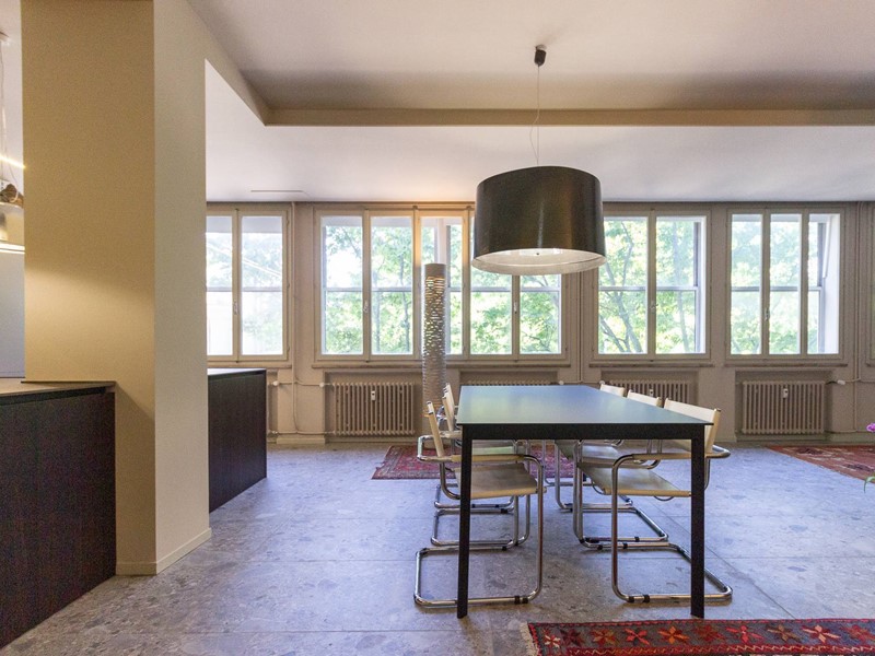 Zona Giorno Open Space: Oltre 80 mq di spazio illuminato da 15 metri di finestre, affacciate sul viale alberato, creando un ambiente accogliente e vivace.