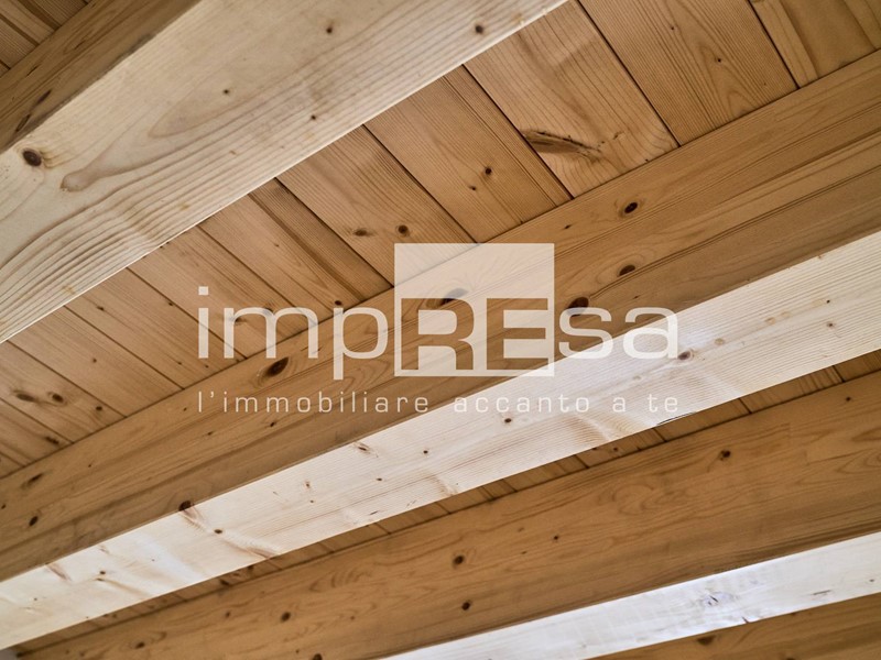 La luce naturale che filtra attraverso le ampie finestre esalta la bellezza delle travi in legno, creando un'atmosfera calda e accogliente.