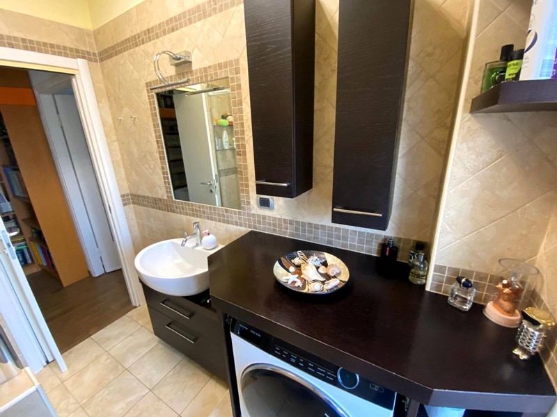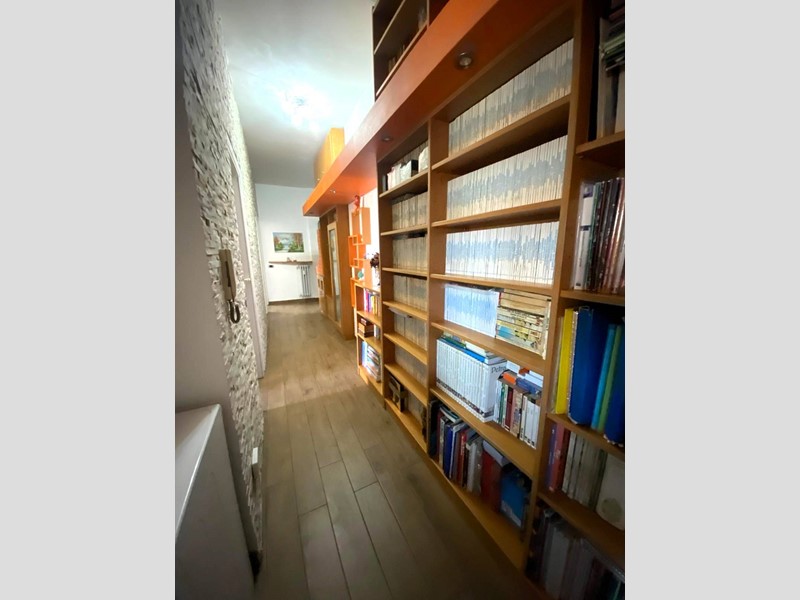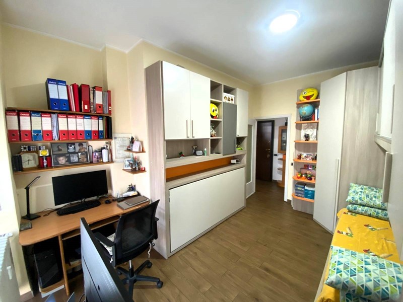 L'appartamento, molto luminoso e panoramico, è così composto: ampio e funzionale disimpegno d'ingresso, ben sfruttato con una libreria su misura realizzata artigianalmente, soggiorno con zona pranzo, cucina separata, due spaziose camere da letto e bagno. Gli ambienti della cucina e della cameretta condividono un comodo balcone. A completare l'offerta una cantina spaziosa al piano interrato.