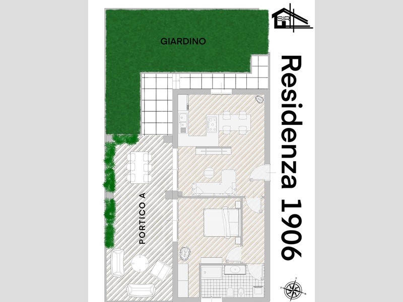 LAppartamento posto al piano terra, è composto da 2 Locali con ampio soggiorno e cucina a vista, camera, antibagno e bagno, portico di mq. 31 oltre a giardino privato.