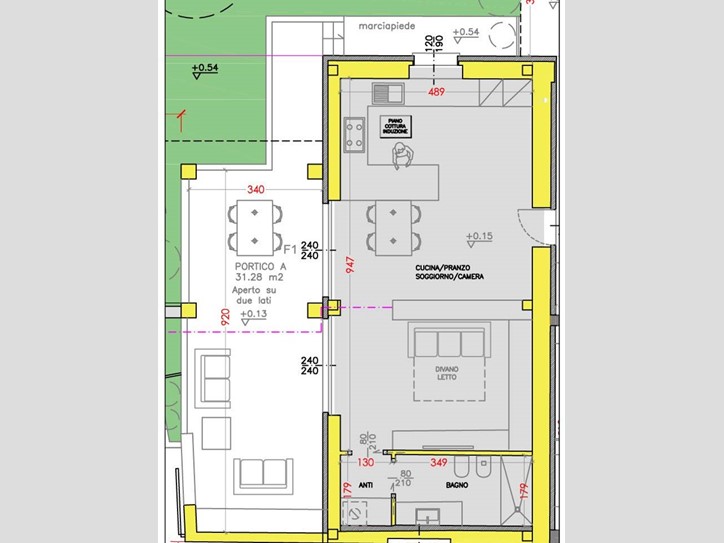 LAppartamento posto al piano terra, è composto da ingresso con ampio soggiorno e cucina a vista, camera e bagno, portico di mq. 36 oltre a giardino privato di mq. 77.