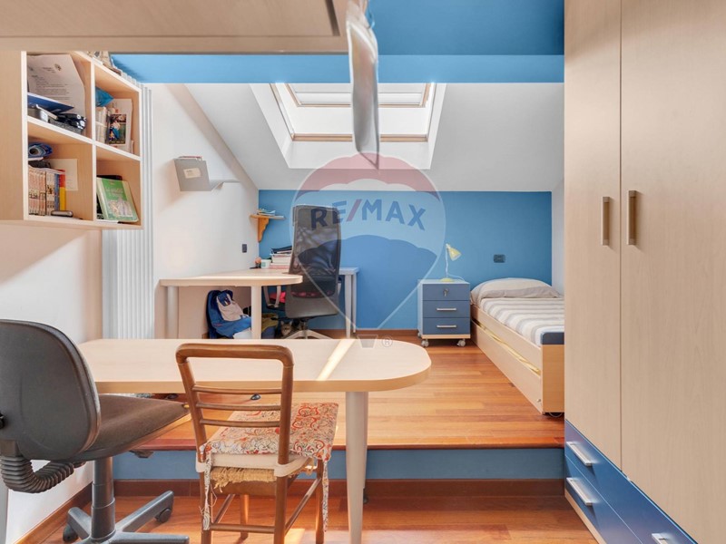 Una elegante scala in legno conduce al piano superiore, dove si trovano altre due camere matrimoniali mansardate con velux, un secondo ripostiglio, un bagno con doccia e uno spazio adibito a studio.