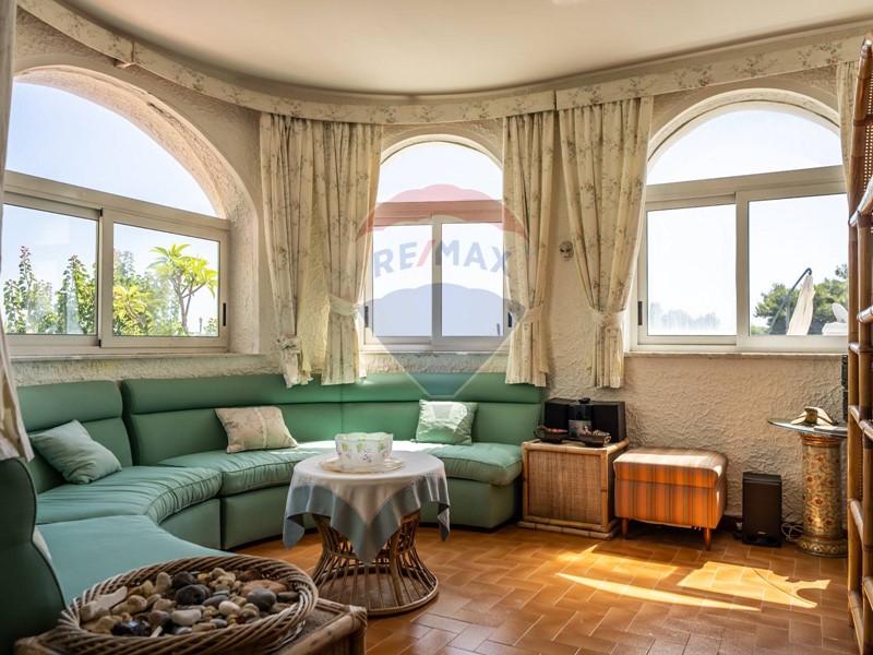 Il corridoio disimpegno ci porta ad una graziosa cucina con uscita con porta finestra su uno dei viali che costeggia la villa e alle due camere da letto con finestra e bellissimo e unico panorama sul mare, mentre il bagno di recente ristrutturazione serve le esigenze del piano, infine una seconda zona living si affaccia sul giardino con un ulteriore terrazzo panoramico.