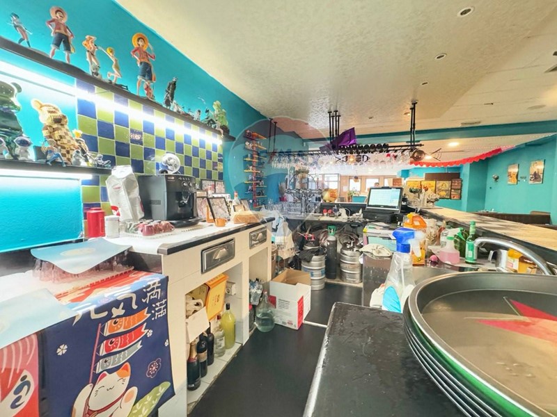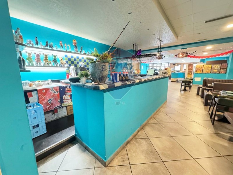 Bancone preparazione Sushi completo di accessori, possibilità di ripristinare il forno a legna per pizza nascosto dietro ad un muro di cartongesso, bancone completo di cassa e servizio di prenotazione elettronica tramite cellulare, due frighi bar per bibite, servizio alla spina.