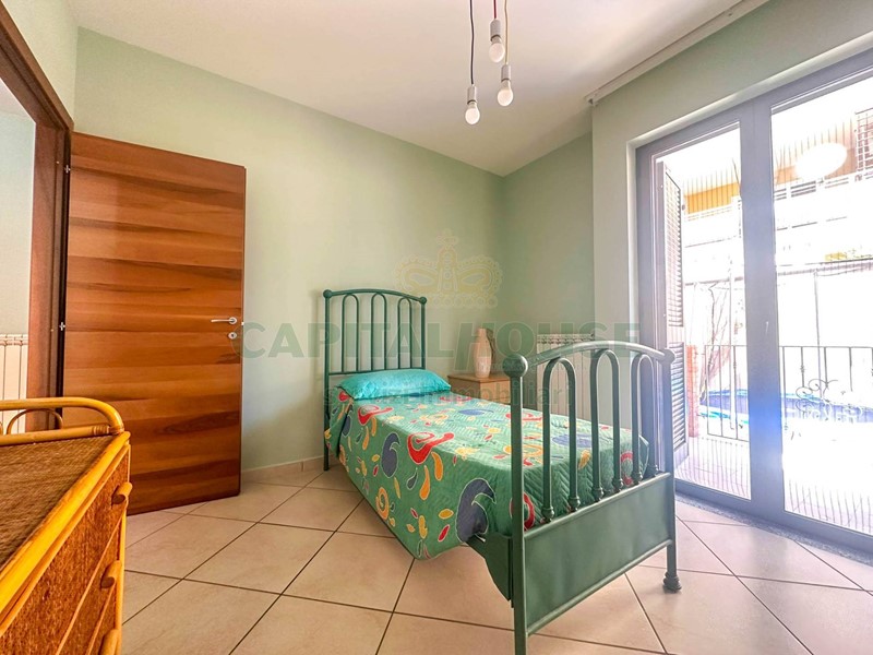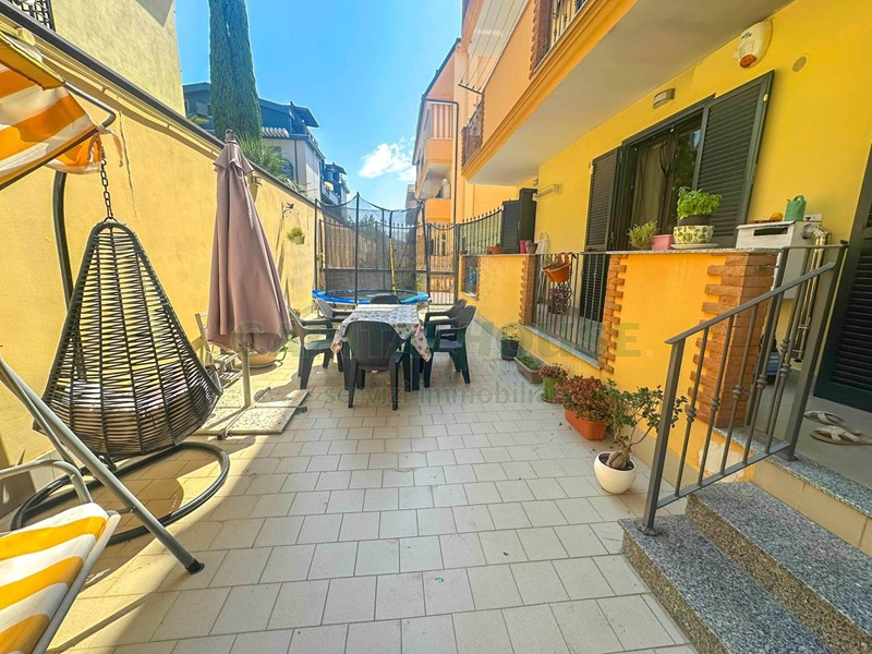 ingresso in salone ampio, cucina ( ove è stata creata anche un'utile dispensa ) che da sullo spazio esterno di pertinenza pavimentato di circa 45 mq , disimpegno con piccolo ripostiglio/cappottiera , tre camere da letto e doppi servizi.