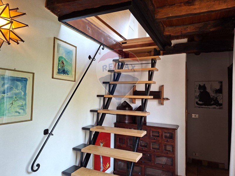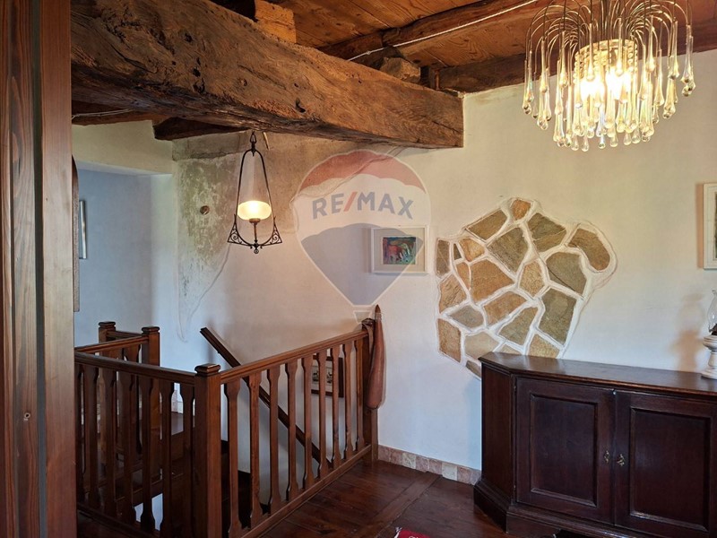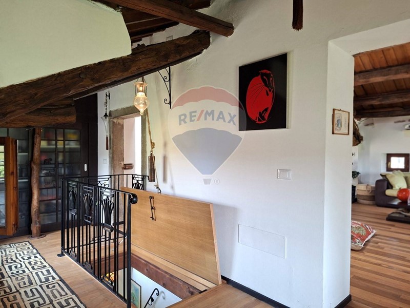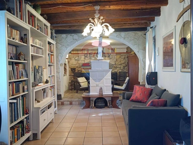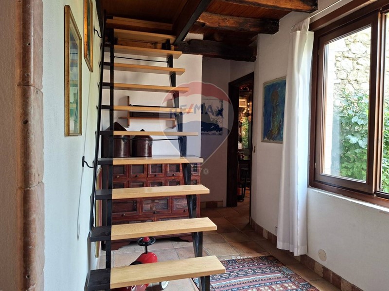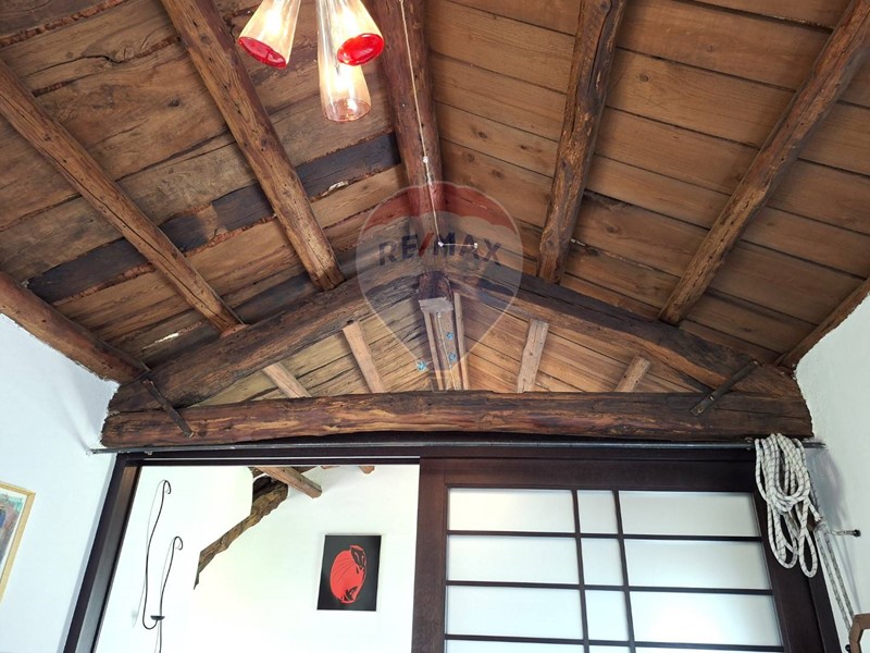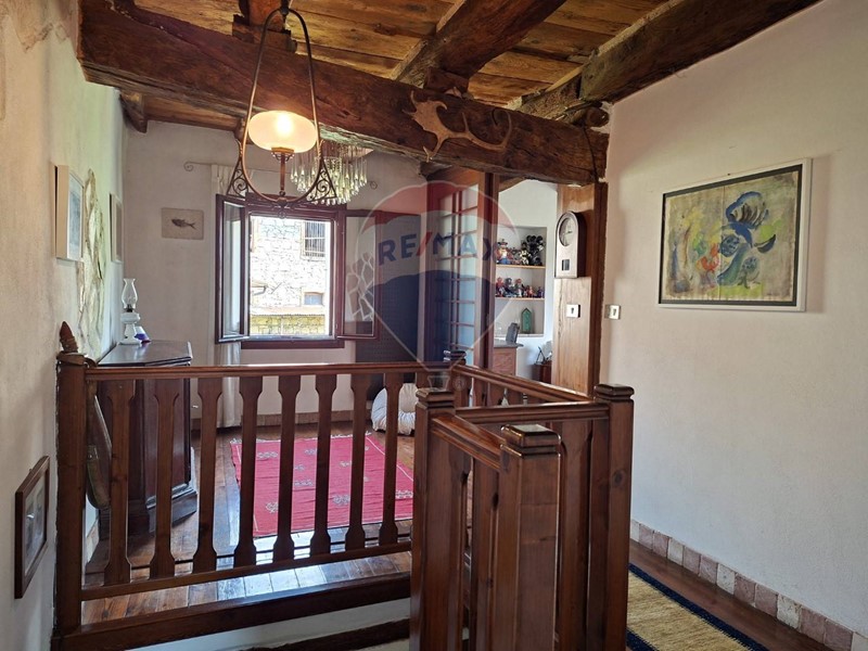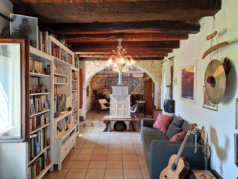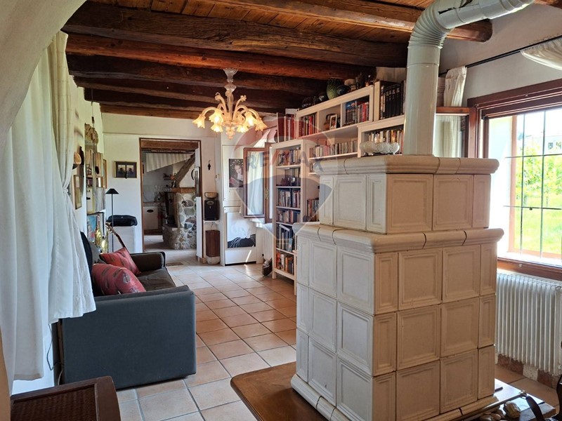 - Al piano terra una cucina abitabile, che mostra il sapiente recupero dell'antico focolare, introduce al salone con stube e zona relax sotto l'antica arcata. Un bagno con doccia e un sottoscala completa il piano terra.