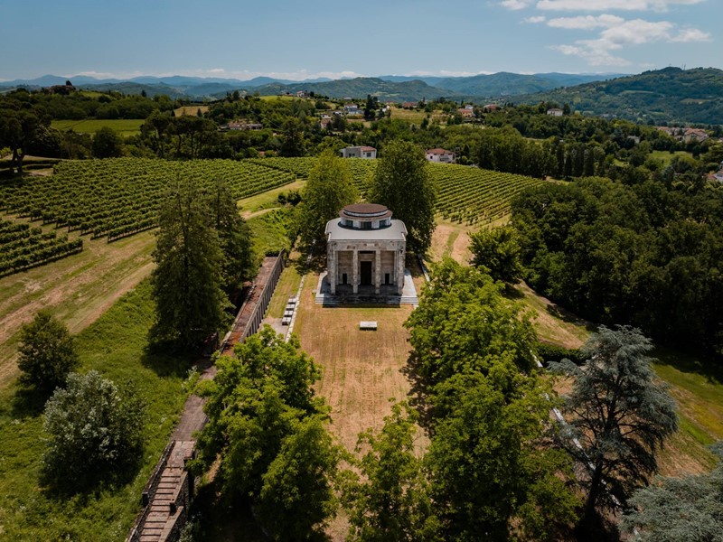 Il Mausoleo Tempio di Herta A breve distanza dalla villa sorge il suggestivo mausoleo oggi conosciuto come Tempio di Herta, immerso in un parco scenografico di sempreverdi noto come "Paradiso Terrestre". Limponente portale in bronzo, nichel e rame inciso opera monumentale dei maestri Ernesto e Mario Ferrari introduce agli interni decorati con affreschi di Ferruccio Ferrazzi e mosaici realizzati dalle rinomate scuole musive Vaticana e di Ravenna.