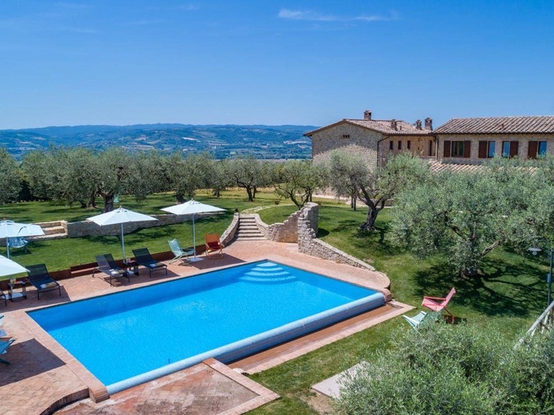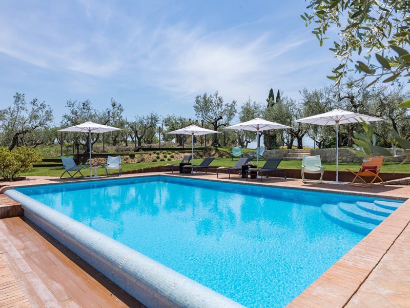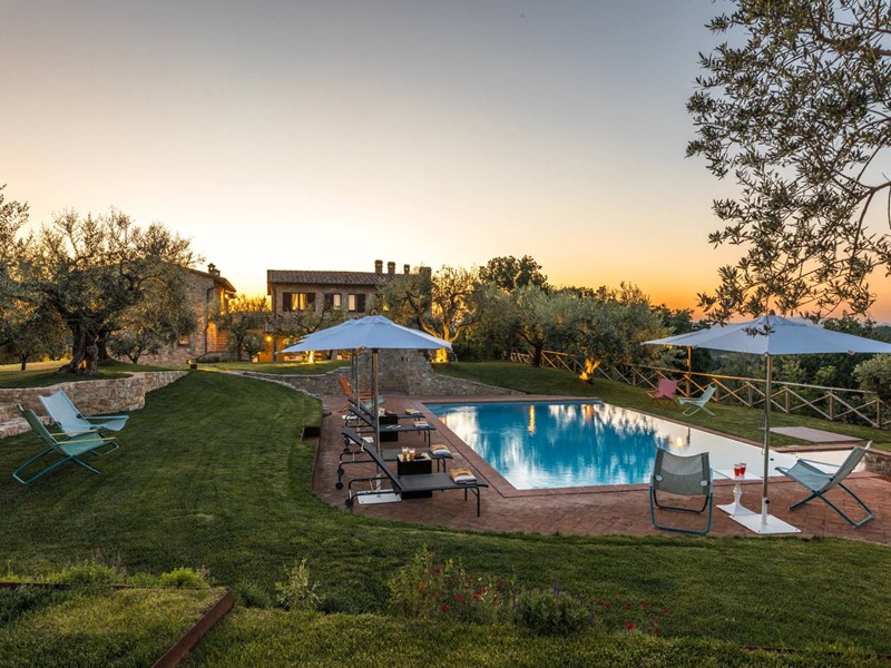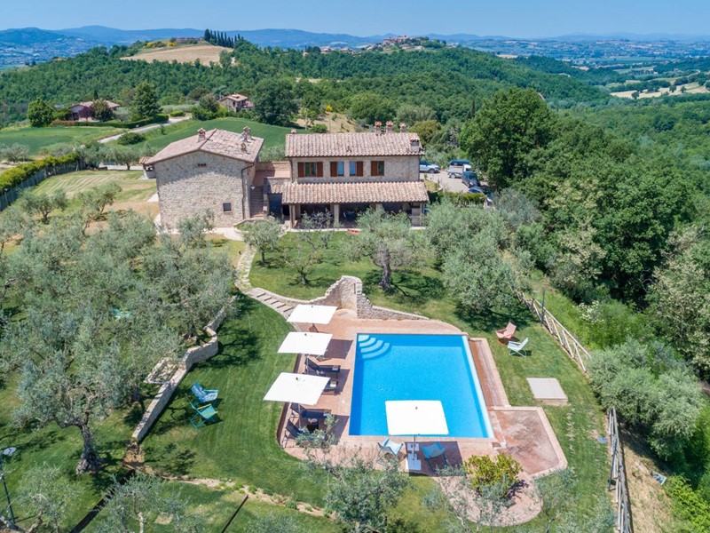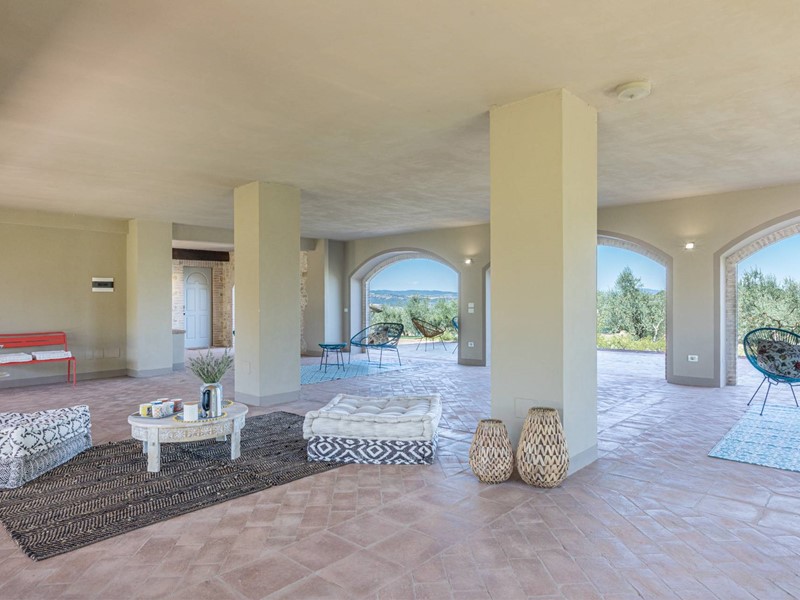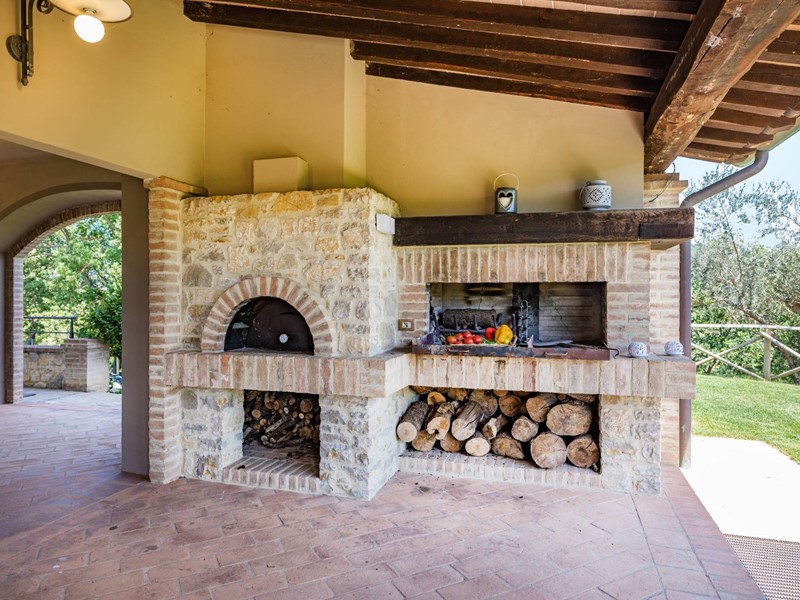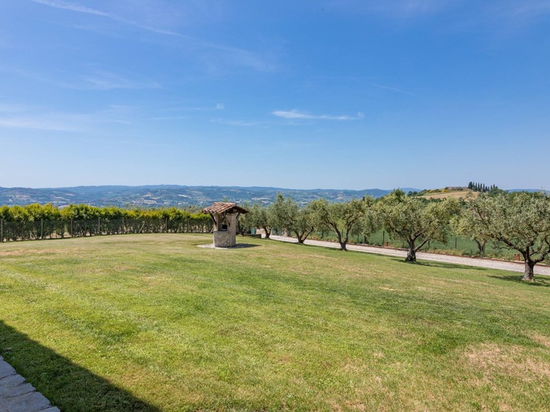 Un rigoglioso giardino di circa 3000 mq abbraccia la residenza, offrendo una cornice di rara bellezza. Il verde curato, gli ulivi secolari e le siepi armoniose creano unambientazione da cartolina. Il portico coperto, di generose dimensioni, si presta a cene conviviali e momenti di relax allaria aperta, con un forno a legna e barbecue in muratura per veri appassionati della cucina. A pochi passi, scendendo pochi gradini in pietra, si apre la scenografica piscina a sfioro, rivestita con mosaici dai toni del cielo e circondata da unarea solarium attrezzata per il massimo del benessere. Il paesaggio che si estende davanti agli occhi, fino a Perugia allorizzonte, regala ogni giorno tramonti spettacolari.