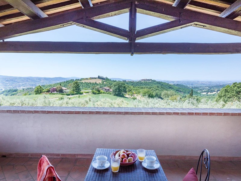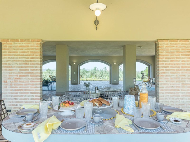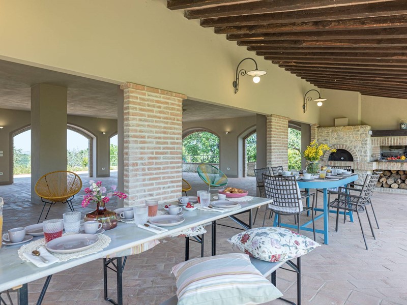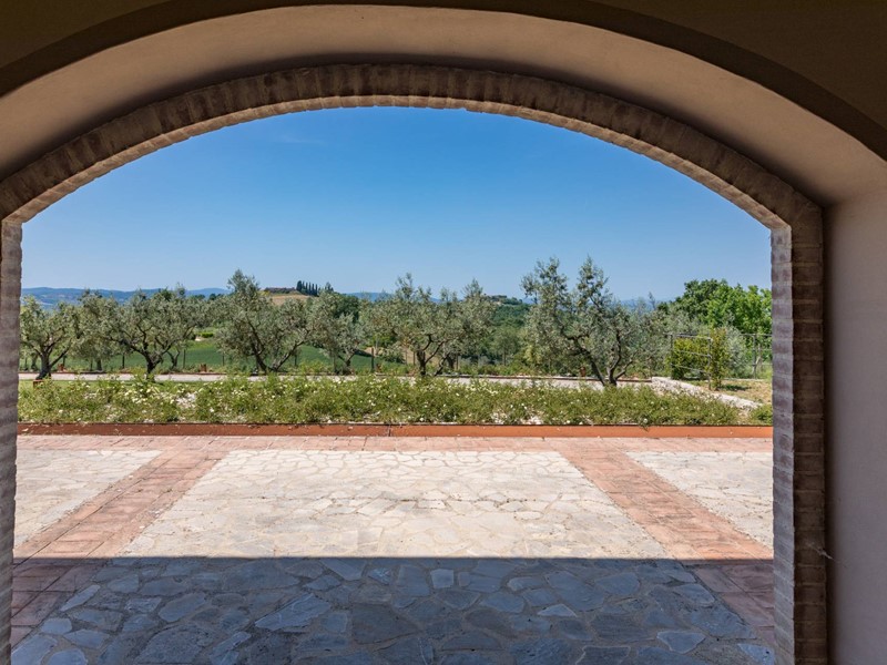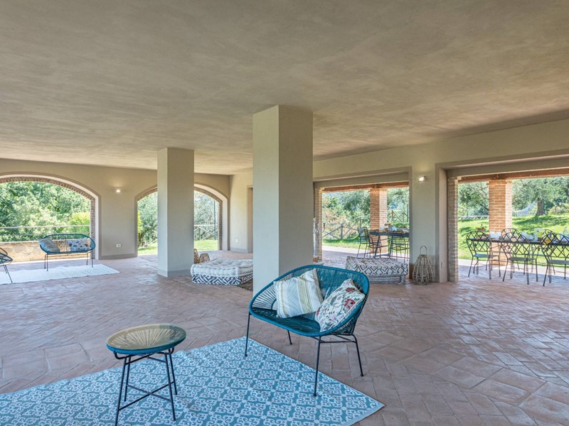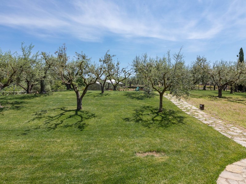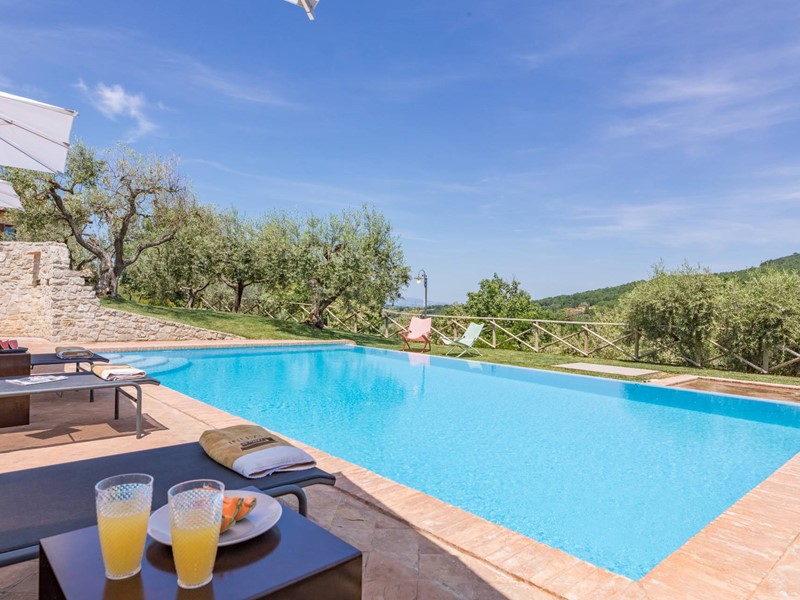 Un rigoglioso giardino di circa 3000 mq abbraccia la residenza, offrendo una cornice di rara bellezza. Il verde curato, gli ulivi secolari e le siepi armoniose creano unambientazione da cartolina. Il portico coperto, di generose dimensioni, si presta a cene conviviali e momenti di relax allaria aperta, con un forno a legna e barbecue in muratura per veri appassionati della cucina. A pochi passi, scendendo pochi gradini in pietra, si apre la scenografica piscina a sfioro, rivestita con mosaici dai toni del cielo e circondata da unarea solarium attrezzata per il massimo del benessere. Il paesaggio che si estende davanti agli occhi, fino a Perugia allorizzonte, regala ogni giorno tramonti spettacolari.